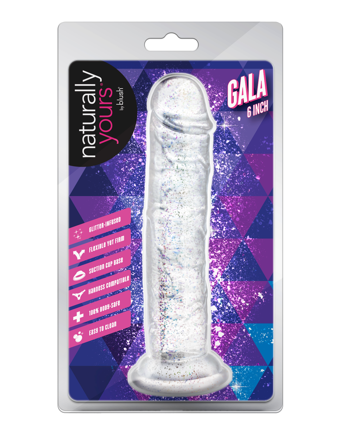 Step into the spotlight with Gala, the glittering star of your pleasure collection. With its radiant color and subtle sparkle, Gala adds a touch of glam to every intimate moment. Perfect for those who like their toys with a little extra flair. At 6 inches, it’s a versatile size that’s ideal for both solo exploration and partnered play. Designed to be flexible yet satisfyingly firm, Gala adapts to your movements while offering a fulfilling experience. The strong suction cup base secures easily to smooth surfaces for hands-free fun and is fully harness compatible, giving you endless options for playful discovery. With its 100% body-safe design, Gala is easy to clean and always ready for an encore. Whether you're indulging in a solo performance or sharing the stage with a partner, Gala ensures every scene ends with a standing ovation.