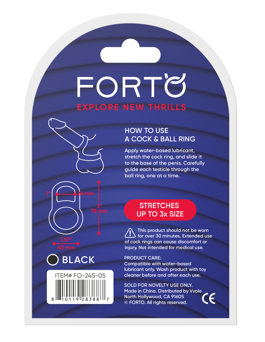 The Forto Lock Cock & Ball Ring delivers firm support with its dual-design sling, wrapping one ring around the balls and the other around the shaft. Made from ultra-soft, stretchy silicone, it provides a secure, comfortable fit that adapts to the body without causing discomfort. Stretching up to three times its size, it’s built for durability, flexibility, and reliable performance. A must-have addition for customers looking for enhanced lift and sensation.