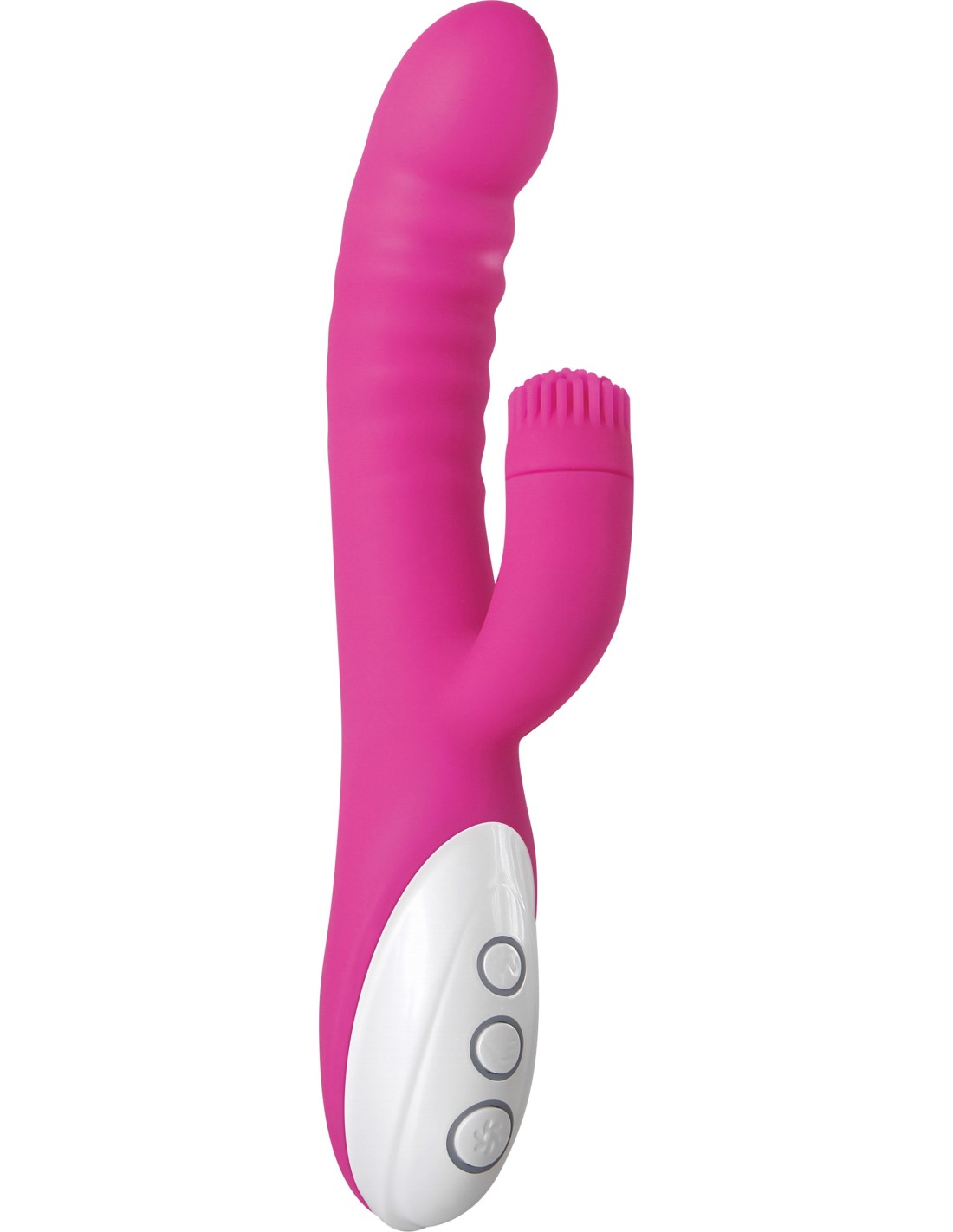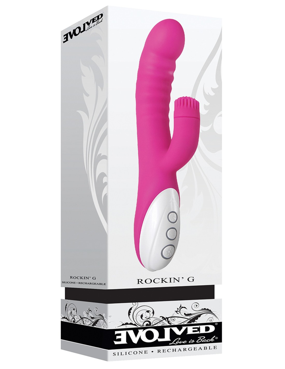 ¡Finalmente, un juguete que señala la mejor manera de estimular el punto G! Esa zona sensible de piel de aproximadamente dos pulgadas dentro del cuerpo de una mujer se puede alcanzar con un dedo usando un movimiento de "ven aquí", ¡y el Rockin G hace precisamente eso! Vibra hasta llegar al punto G y se dobla suavemente hacia adelante y hacia atrás para que puedas concentrarte sin esfuerzo en experimentar el orgasmo más increíble hasta el momento. Luego, con el estimulador giratorio del clítoris y sus diminutos dedos de silicona haciendo su magia, ¡recibirás un dúo-gas que te hará vibrar y rodar hasta alcanzar una completa satisfacción!