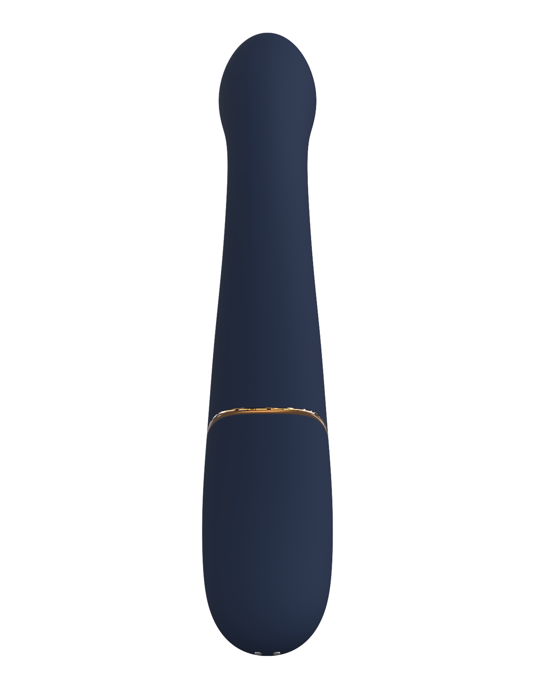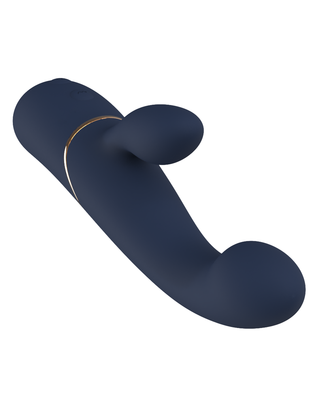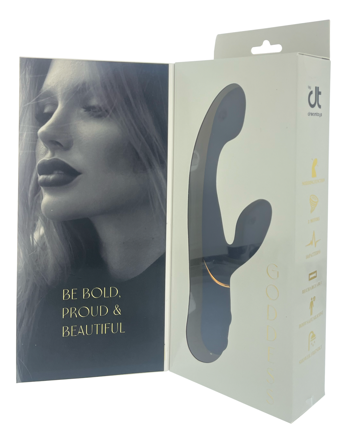 Duo vibrator Hestia, with nodding function. In the same style as the other Goddess Collection toys, Hestia vibe is made of dark blue silicone with gold coloured details. The Goddess Collection duo vibe has 10 nodding vibrations in the main body and 7 vibration rhythms and 3 speeds in the clitoris stimulator. For ease of use there are separate buttons for control of the functions in the main body and those in the clitoral stimulator. The vibrator is shower friendly, made of bodysafe materials and rechargeable with the included magnetic USB cable.