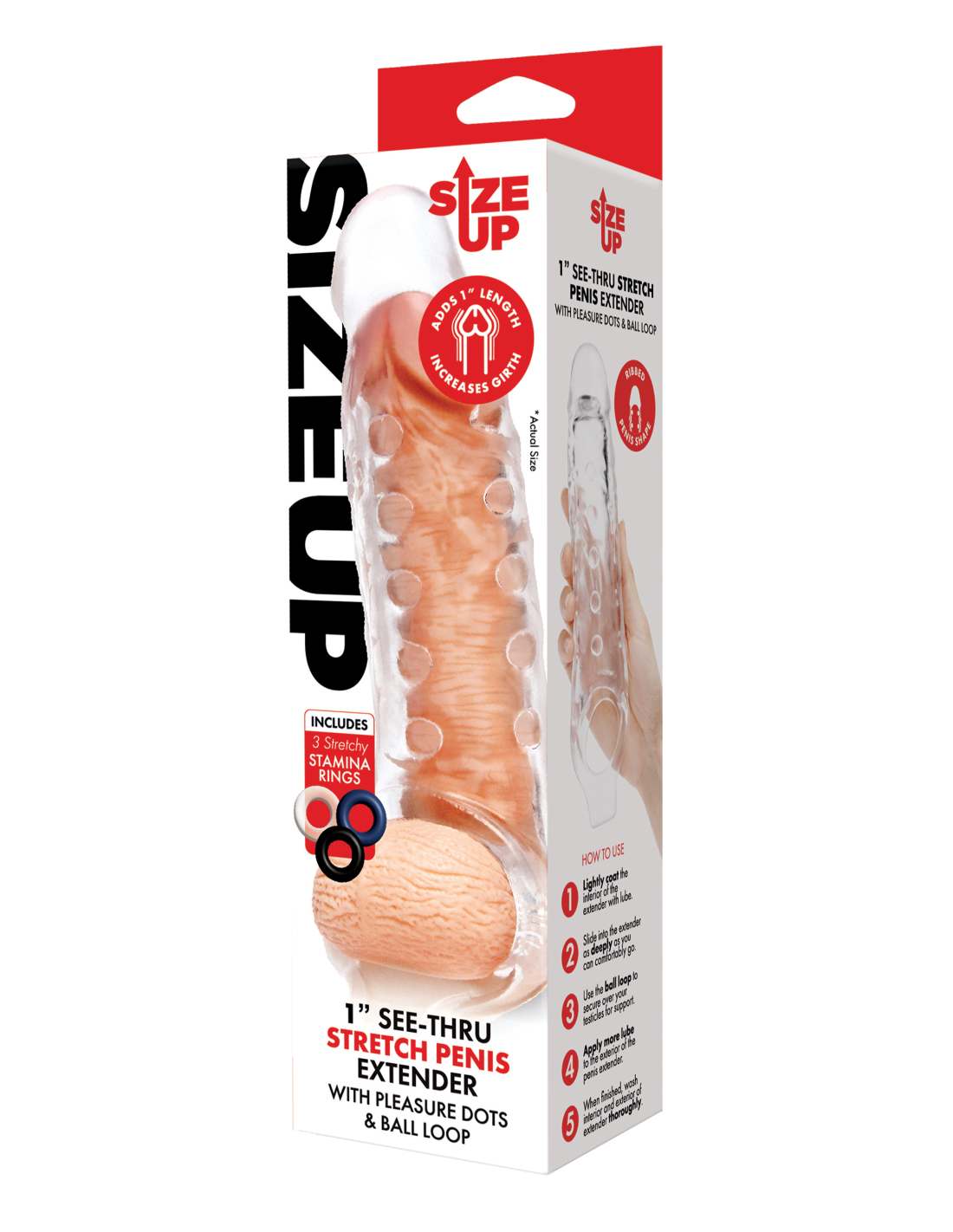 You can use this realistic extender to add length and girth while enjoying additional stimulation from the pleasure nubs as you thrust into your lover. The clear material is visually stimulating, the pleasure dots add an extra sensation and the ball loop helps secure the extender in place for full comfort. Use the three included rings to increase your stamina and enhance your pleasure.
