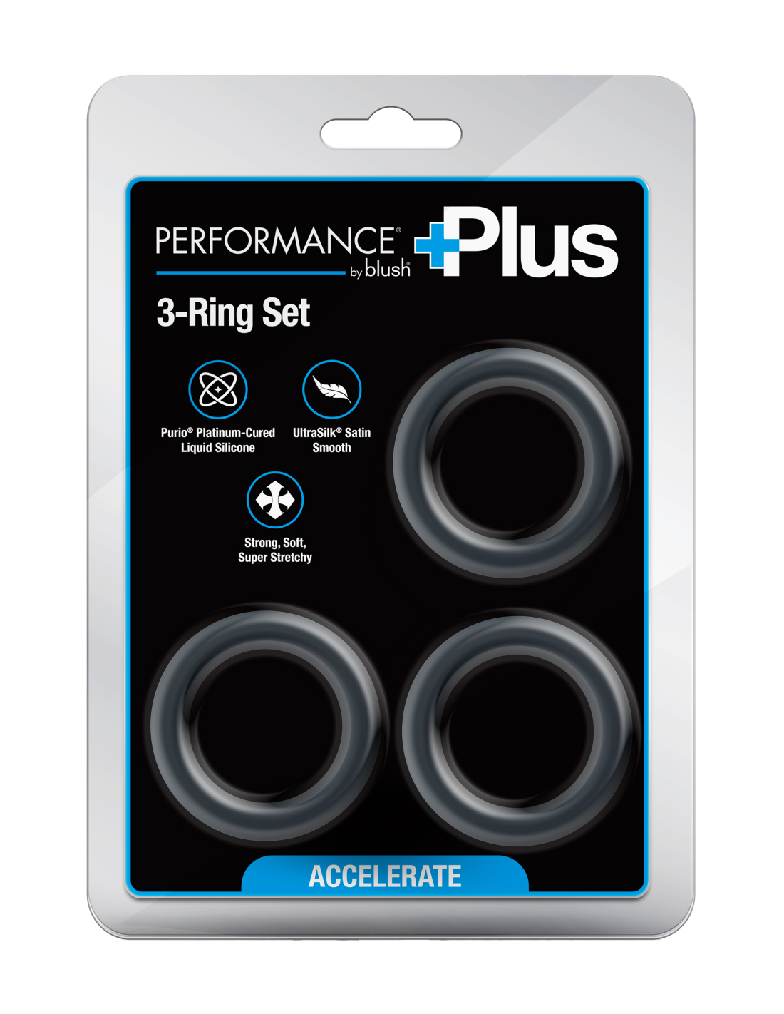 Maximize and boost pleasure with Performance® Plus Accelerate! This 3-ring set offers versatile options for enhancing stamina, maintaining firmer erections, and intensifying sensations during both solo and partnered play. Whether you're prolonging performance or exploring new levels of stimulation, Accelerate provides the tools to customize your experience. Accelerate rings are crafted from Purio® platinum-cured liquid silicone, wrapped in an UltraSilk® satin smooth finish that feels luxurious against the skin. The super stretchy design accommodates most sizes comfortably, providing a snug fit without discomfort. Stay in the driver’s seat with Accelerate, built for those who like to take control and keep the momentum going.