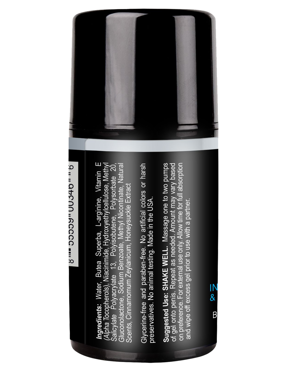 Water, Butea Superba, L-arginine, Vitamin E (Alpha Tocopherols), Niacinimide, Hydroxyethylcellulose, Methyl Salicylate Polyacrylate 13, Polyisobutene, Polysorbate 20, Gluconolactone, Sodium Benzoate, Methyl Nicontinate, Natural Scents, Cinnamomum Zeylanicum, Honeysuckle Extract