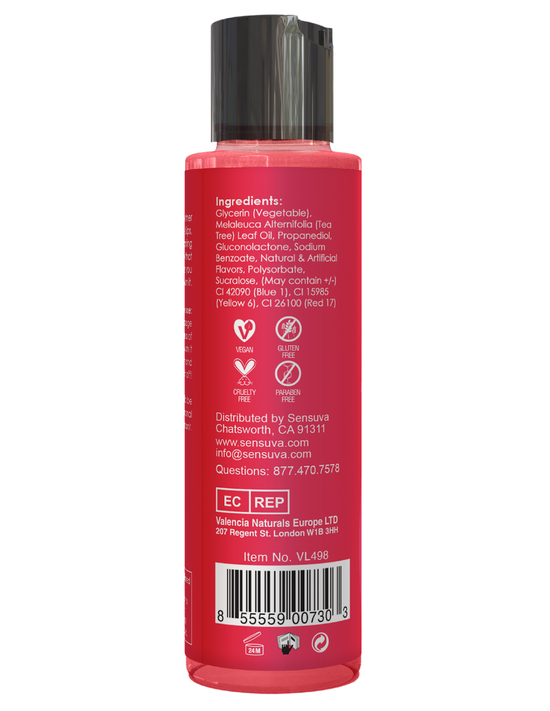 Glycerin (Vegetable), Melaleuca Alternifolia (Tea Tree) Leaf Oil, Propanediol, Gluconolactone, Sodium Benzoate, Natural & Artificial Flavors, Polysorbate, Sucralose, (May contain +/-) CI 42090 (Blue 1), CI 15985 (Yellow 6), CI 26100 (Red 17)