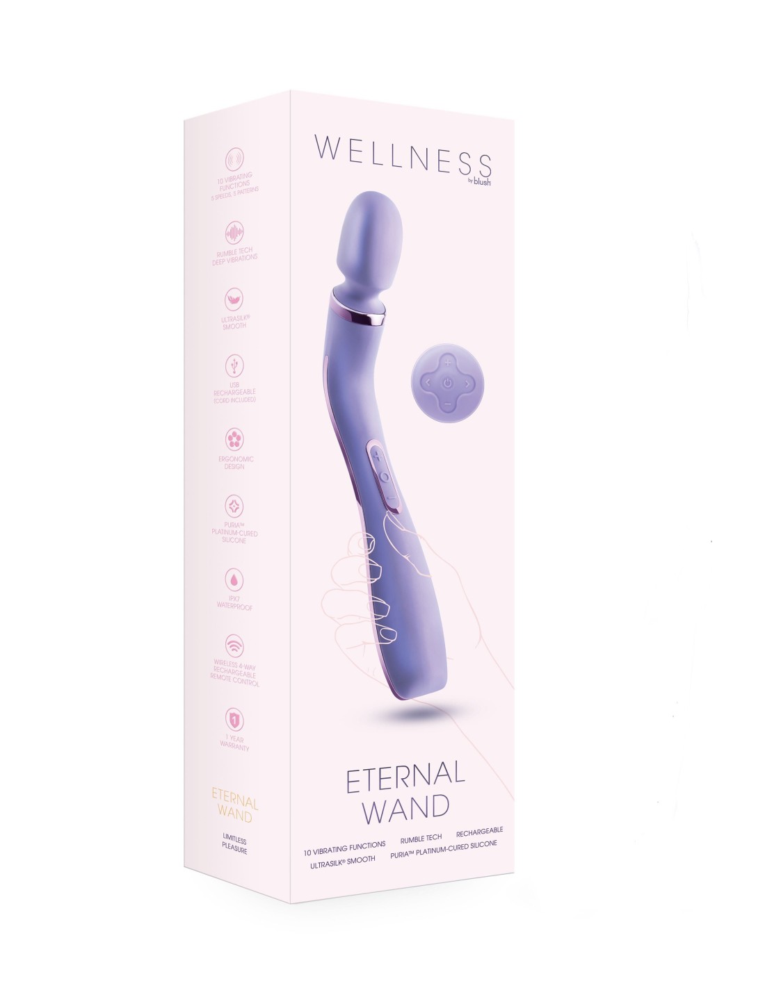 Presentamos la varita Wellness Eternal de Blush. Es una varita de masaje vibratoria recargable de silicona con control remoto, el complemento perfecto para su rutina de cuidado personal.