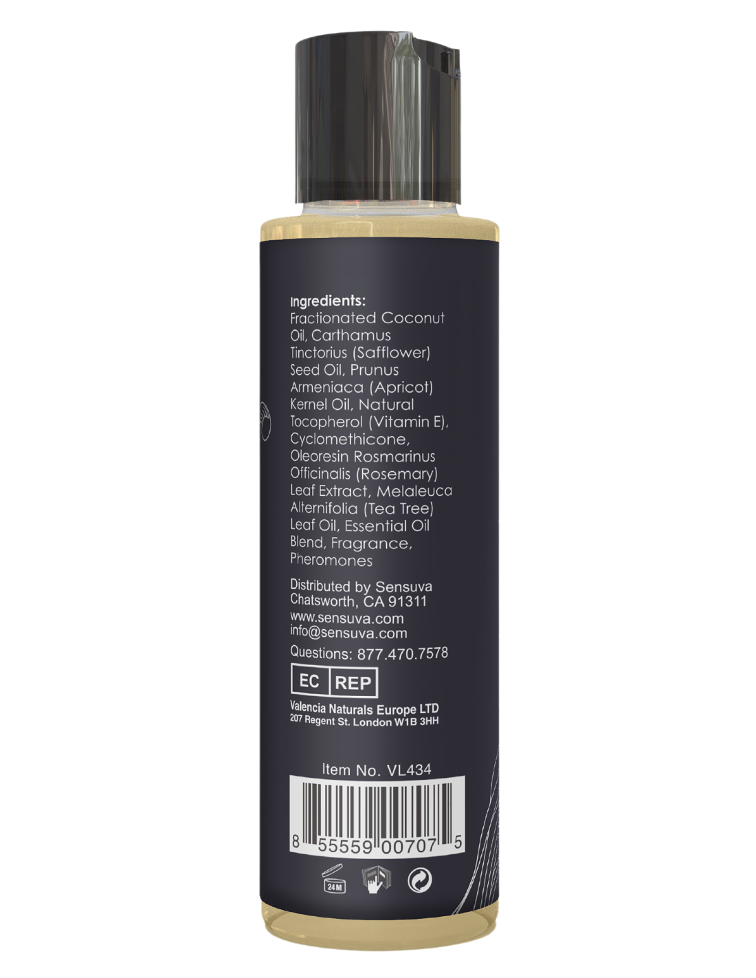 Aceite de coco fraccionado, aceite de semilla de Carthamus tinctorius (cártamo), aceite de semilla de Prunus armeniaca (albaricoque), tocoferol natural (vitamina E), ciclometicona, oleorresina Rosmarinus officinalis (romero) extracto de hoja, aceite de hoja de Melaleuca alternifolia (árbol de té), mezcla de aceites esenciales, fragancia, feromonas
