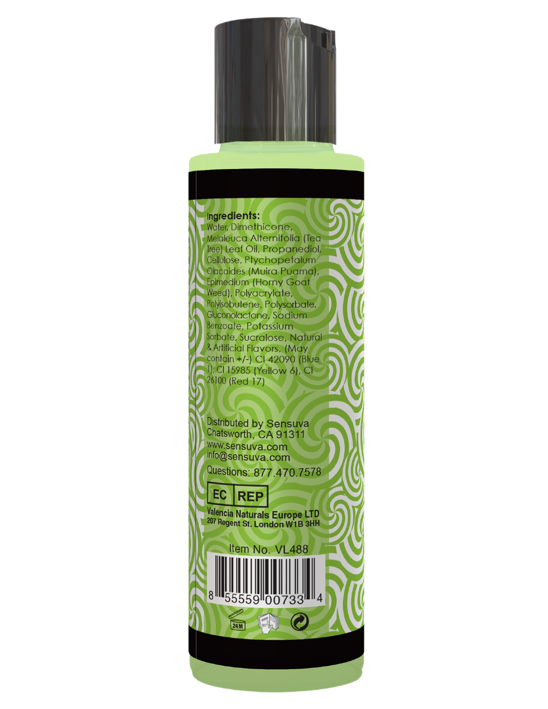 Agua, dimeticona, aceite de hoja de Melaleuca Alternifolia (árbol de té), propanodiol, celulosa, Ptychopetalum olacoides (Muira Puama), Epimedium (hierba de cabra en celo), poliacrilato, poliisobuteno, polisorbato, gluconolactona, benzoato de sodio, sorbato de potasio, sucralosa, sabores naturales y artificiales, (puede contener +/-) CI 42090 (azul 1), CI 15985 (amarillo 6), CI 26100 (rojo 17)