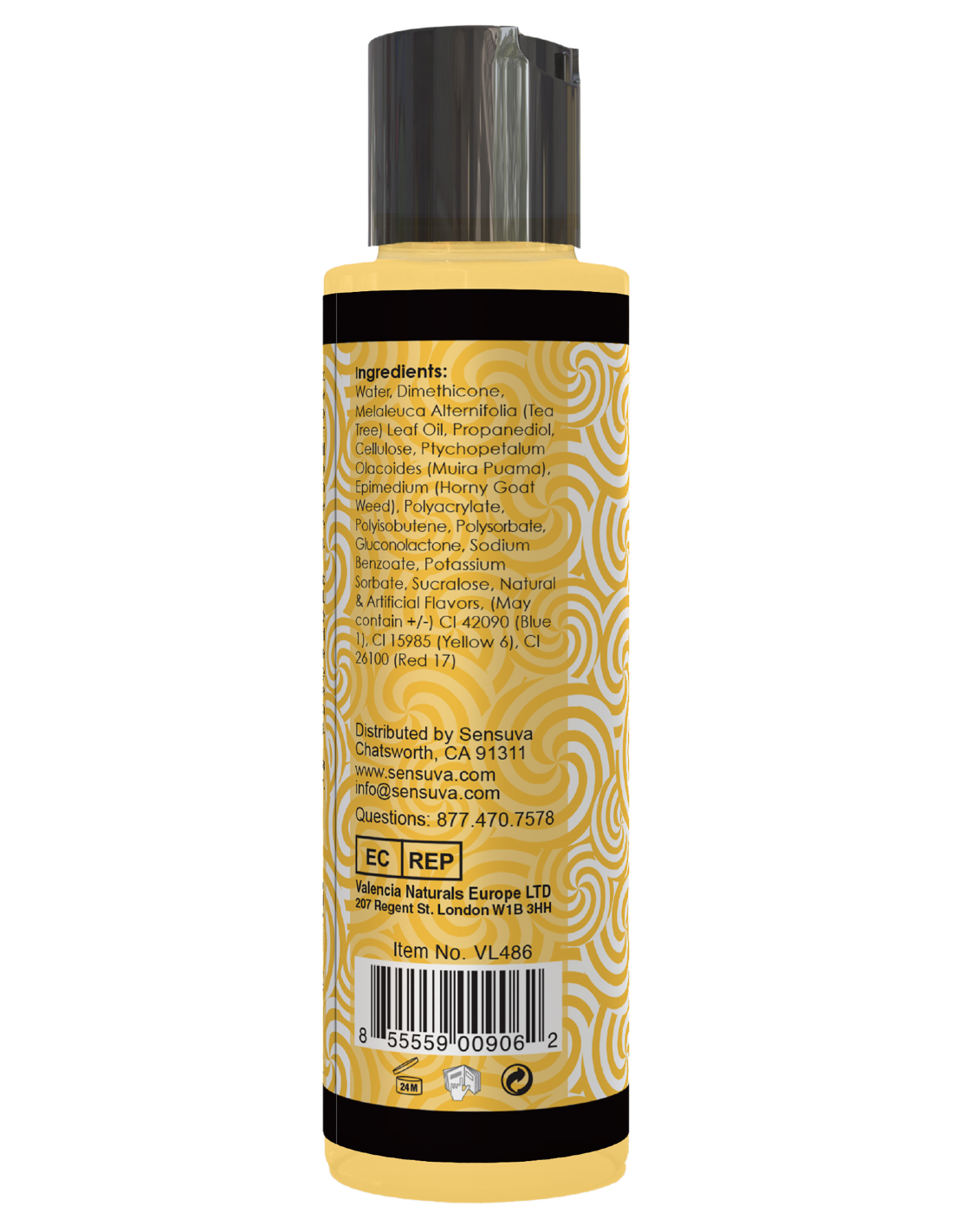 Agua, dimeticona, aceite de hoja de Melaleuca Alternifolia (árbol de té), propanodiol, celulosa, Ptychopetalum olacoides (Muira Puama), Epimedium (hierba de cabra en celo), poliacrilato, poliisobuteno, polisorbato, gluconolactona, benzoato de sodio, sorbato de potasio, sucralosa, sabores naturales y artificiales, (puede contener +/-) CI 42090 (azul 1), CI 15985 (amarillo 6), CI 26100 (rojo 17)