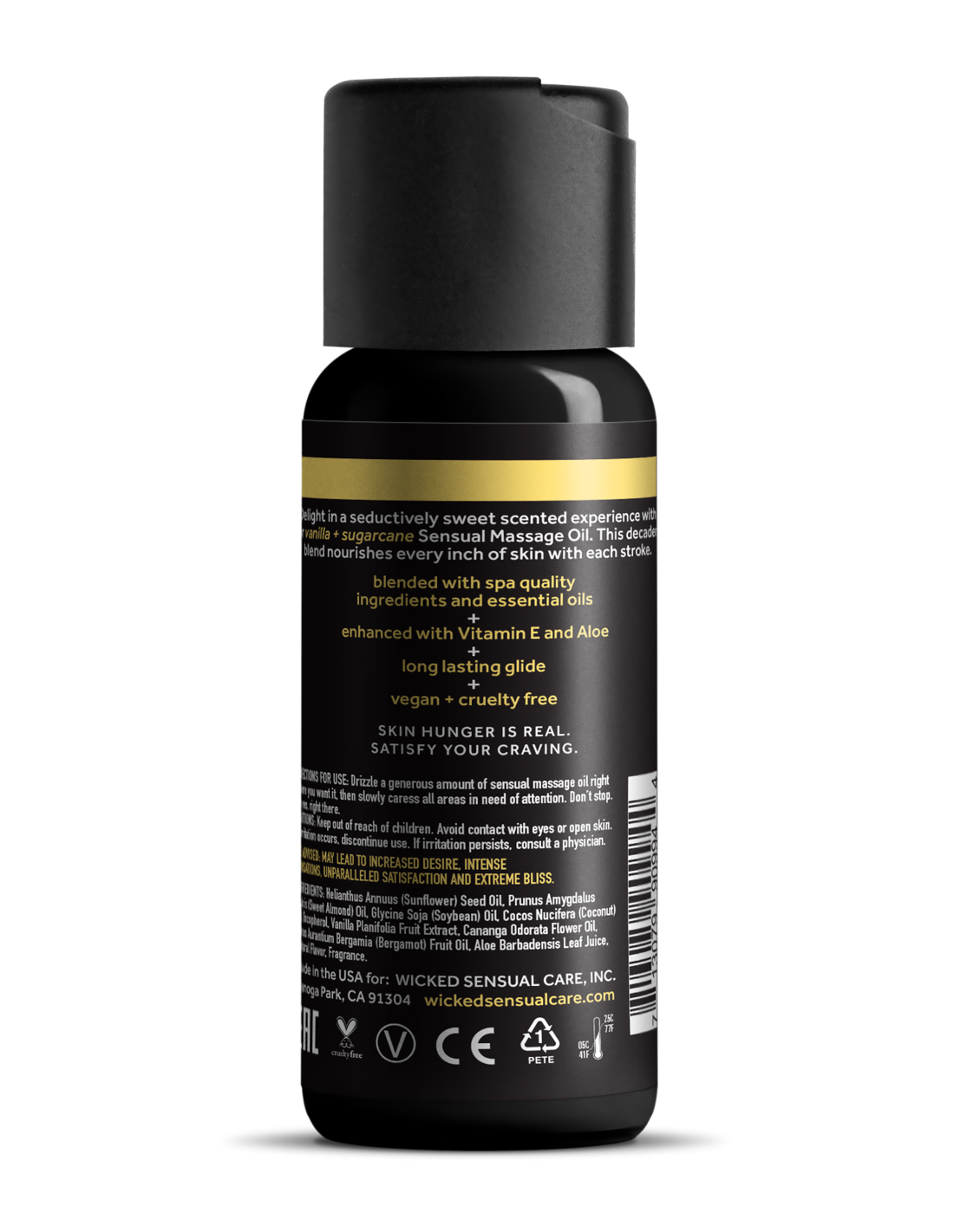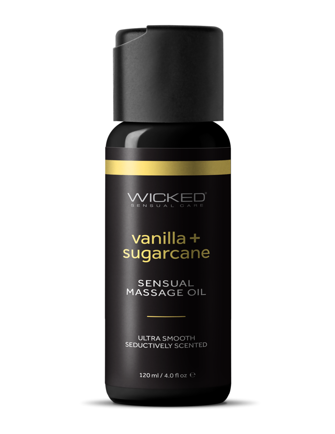 Deléitate con una experiencia perfumada seductoramente dulce con Wicked Sensual Care Aceite de Masaje Sensual de vainilla + caña de azúcar.