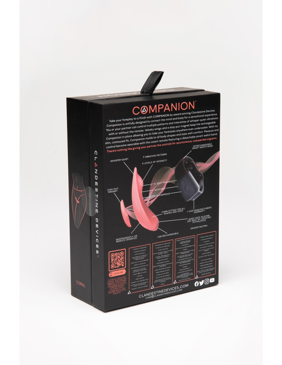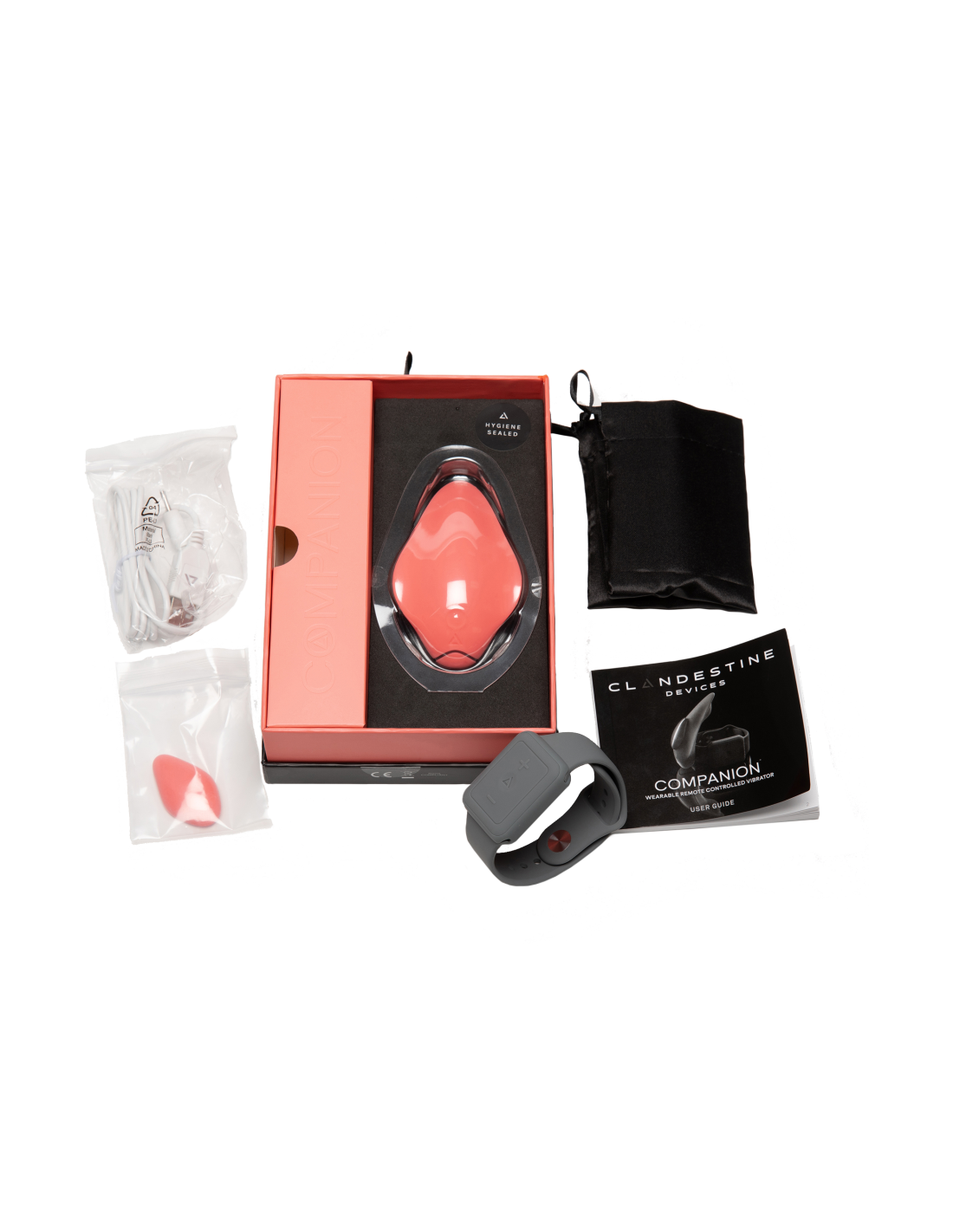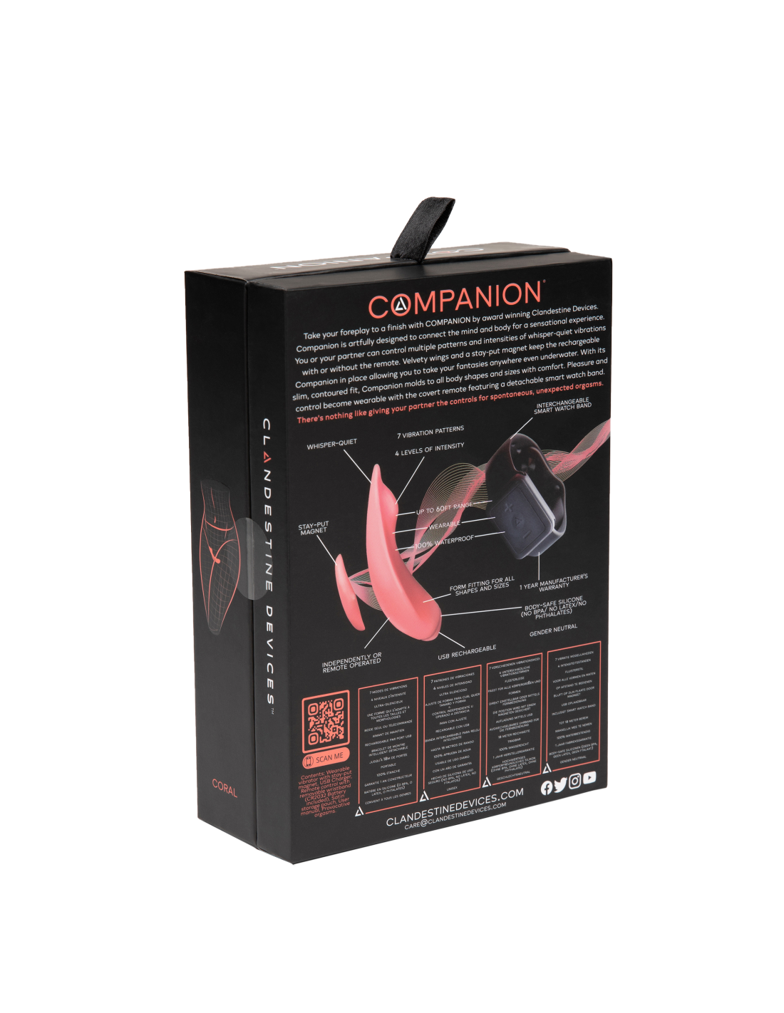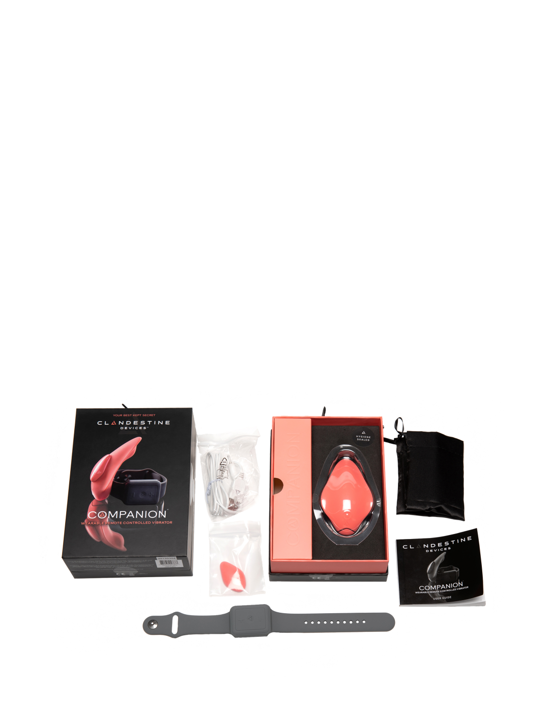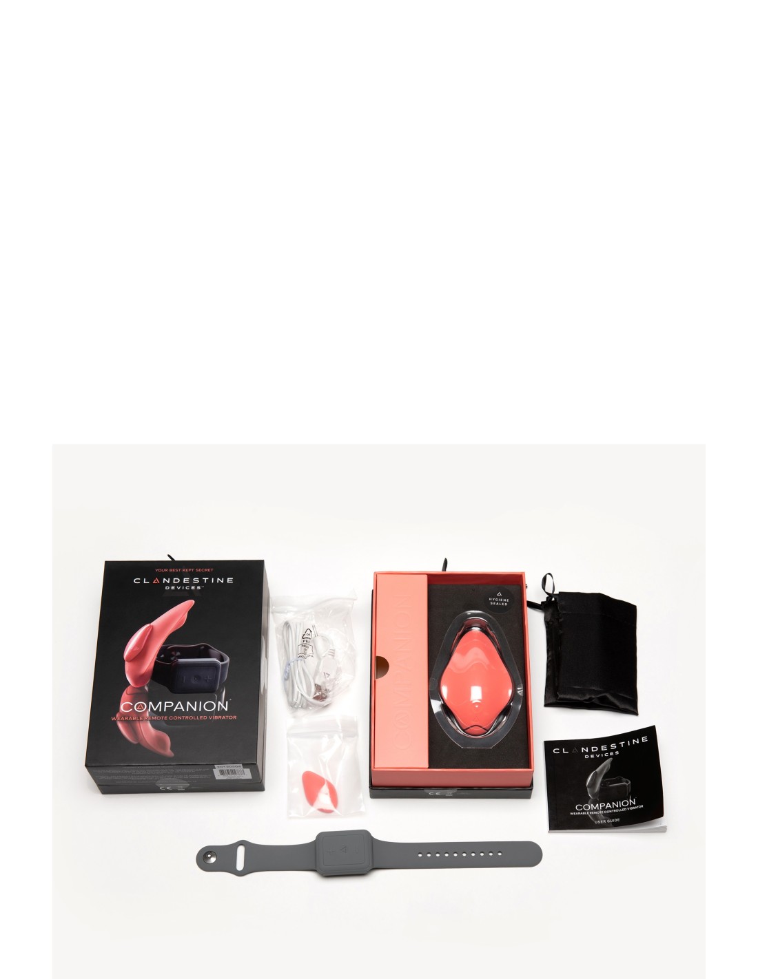 COMPANION es el dispositivo de juego en pareja definitivo para un placer inesperado y sorpresa para usted o su pareja, o como un estimulador independiente y discreto. COMPANION es una vibra portátil (bragas), que también viene con un control remoto (de muñeca) portátil y discreto, con bandas desmontables, que se asemejan a un reloj inteligente o un Fitbit. Un imán de ajuste seguro y un contorno ergonómico brindan máxima capacidad de ajuste y comodidad para todas las formas y tamaños en la comodidad de su ropa interior o la de su pareja.