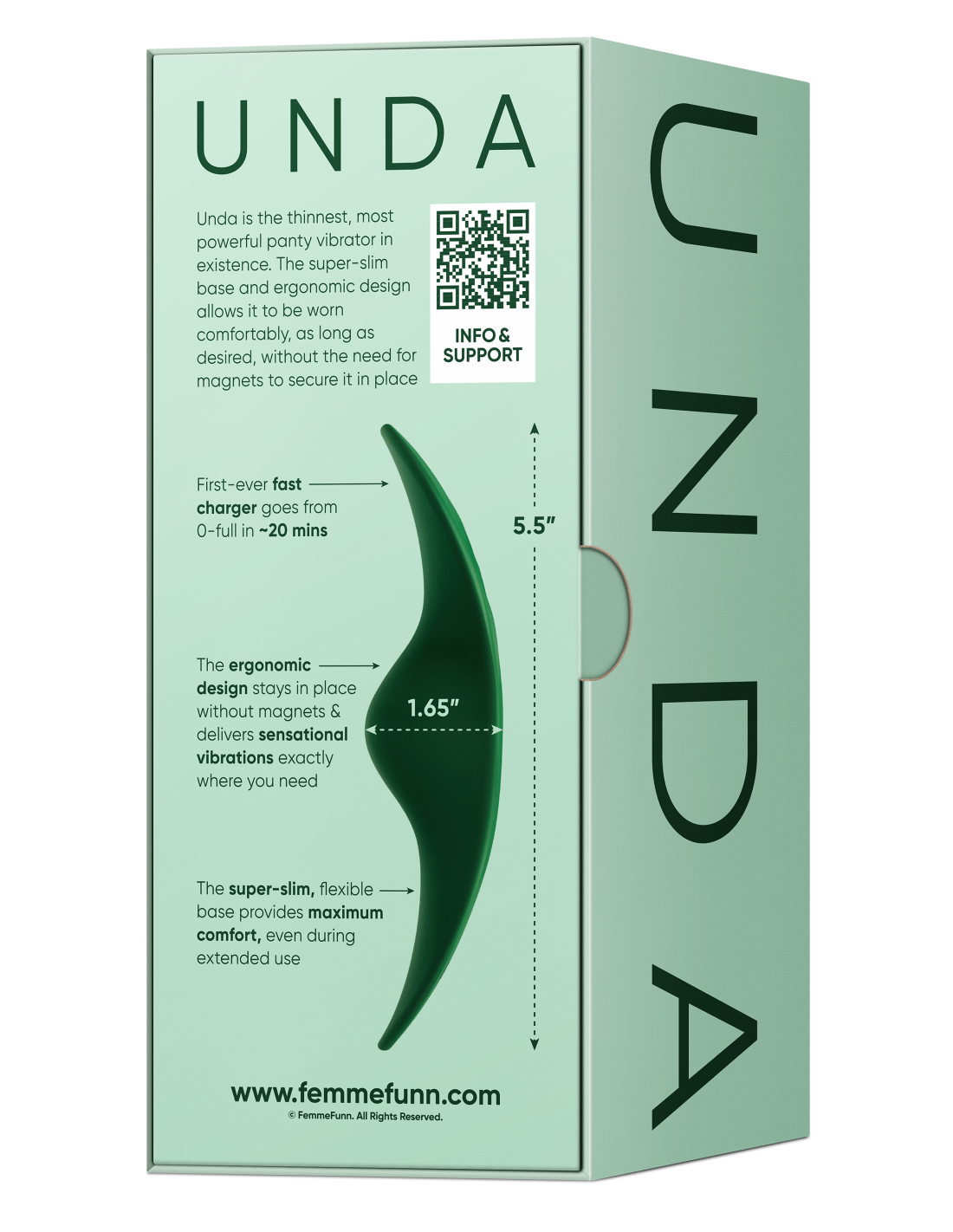 Unda Panty Vibe: Unda es el vibrador de bragas más fino y potente que existe. La base superfina y el diseño ergonómico permiten llevarlo cómodamente, todo el tiempo que se desee, sin necesidad de imanes para asegurarlo en su lugar. El diseño ergonómico se mantiene en su lugar sin imanes y emite vibraciones sensacionales exactamente donde las necesita. La base superdelgada y flexible proporciona la máxima comodidad, incluso durante un uso prolongado.