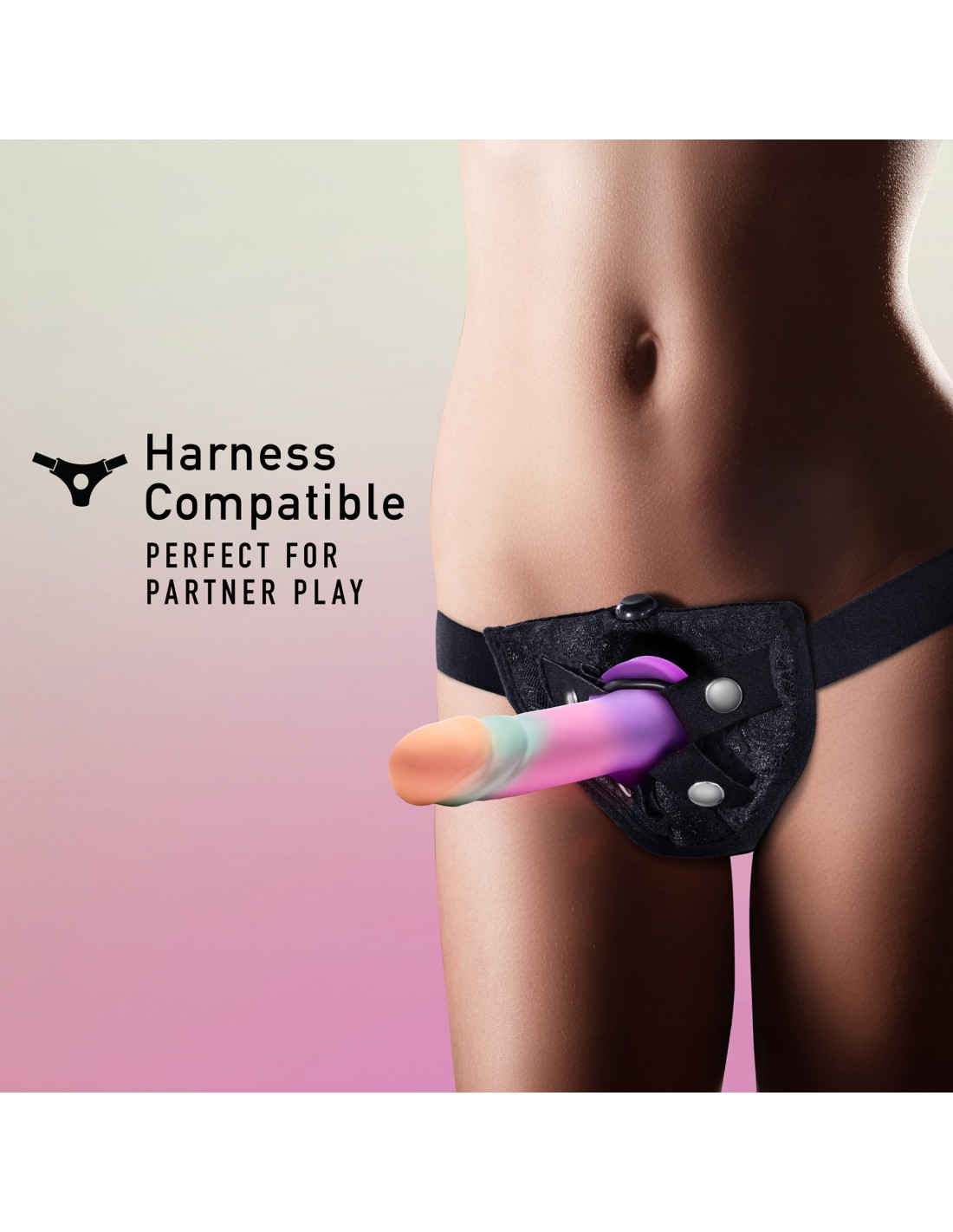 - Fuerte base de succión y arnés compatibles para el placer de las manos libres