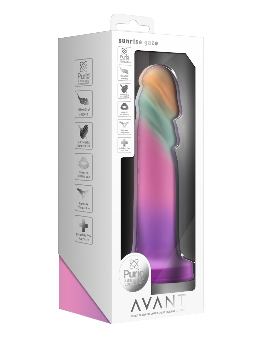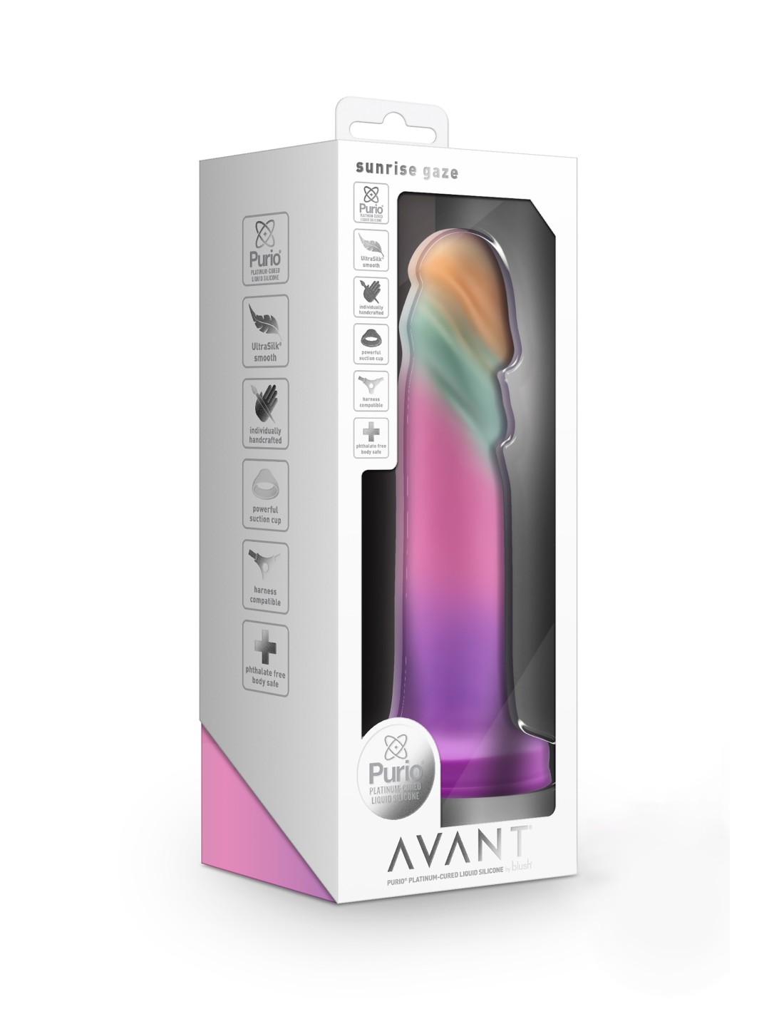 Moderno, elegante y hermoso: ¡conoce Avant Sunrise Gaze! Este consolador artesanal está esculpido a mano pensando en tu máximo placer y comodidad, elaborado con un tono sorbete pastel que te brinda toda la intimidad de un cálido amanecer de verano. Avant Sunrise Gaze hace alarde de una shaft elegantemente ancha, con crestas texturizadas y una cabeza ancha para maximizar el placer de los puntos G y P durante el juego. Está confeccionado con Purio®, la mejor silicona líquida curada con platino y envuelto en UltraSilk® suave y satinado, lo que proporciona una sensación supremamente suave al penetrar. Avant es seguro para el cuerpo, libre de ftalatos, fragancias, látex y parafinas. También es compatible con un arnés con una fuerte base de ventosa que abre un mundo de nuevas posibilidades fascinantes para el juego con manos libres. Deja que Avant Sunrise Gaze sea tu invitación a explorar el amanecer de tus deseos más profundos, iluminando tu camino hacia el placer personal como la primera luz del amanecer.