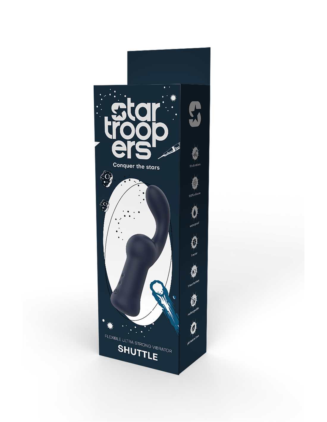 Shuttle tiene una clasificación IPX6 de resistencia al agua y está hecho de silicona suave y tersa y ABS que no contiene ftalatos y es seguro para el cuerpo. Después de una carga completa, el vibrador prostático flexible Star Trooper está listo para 60 minutos de estimulación. El juguete tiene un orificio de carga impermeable y se incluye un cable USB.