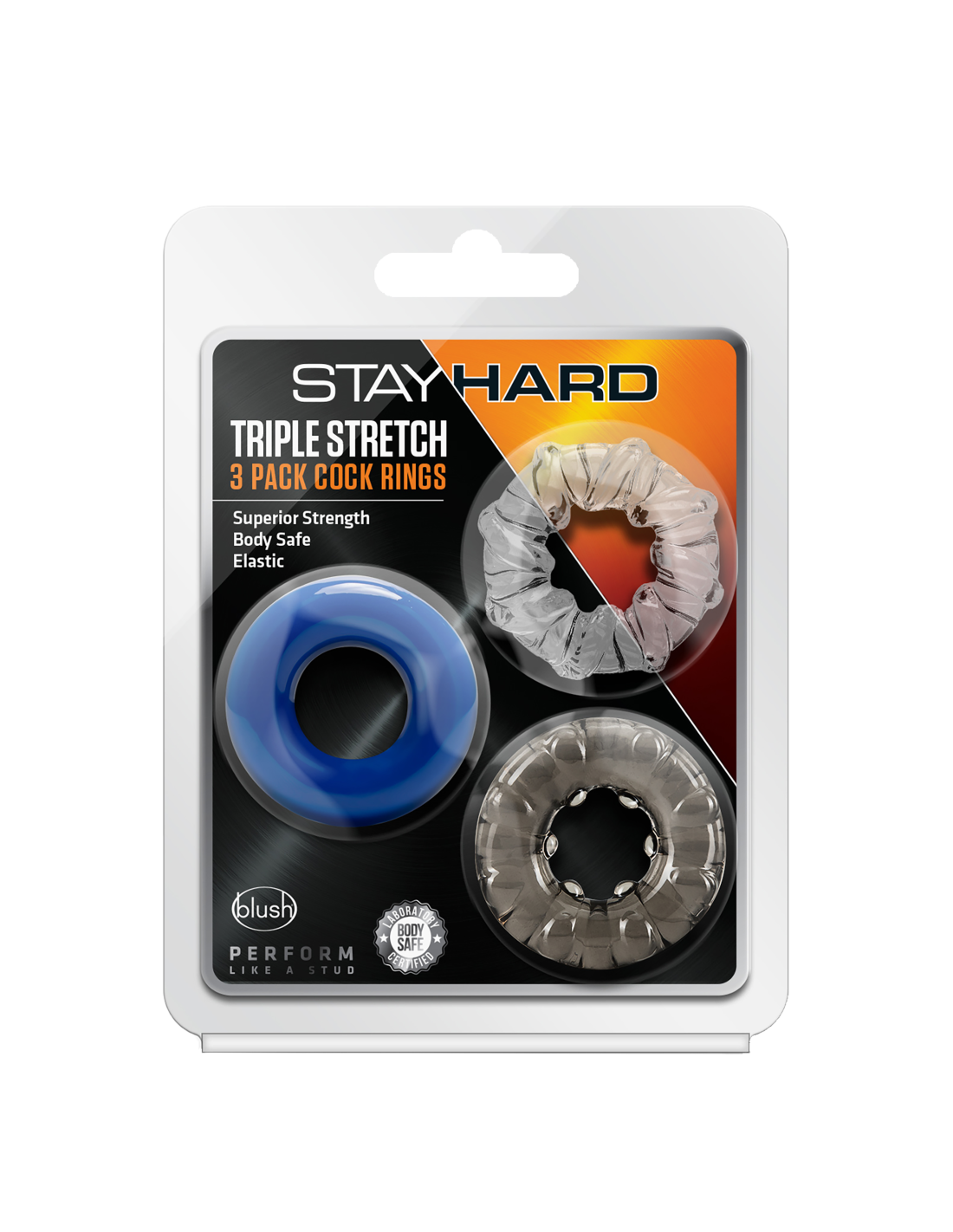 ¡Juega duro, juega cómodo! El paquete de 3 anillos para el pene Stay Hard Triple Stretch te ofrece tres anillos que te hacen sentir bien, lucen sexys, generan presión y amplían tus posibilidades orgásmicas. Además son elásticos, fáciles de poner, súper cómodos y reutilizables. Fabricados con TPE de primera calidad, no contienen ftalatos y son fáciles de limpiar.