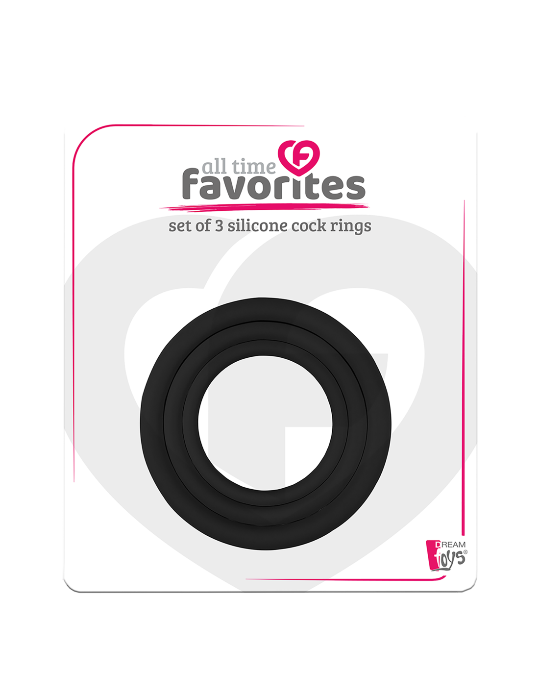 Este juego de anillos de silicona para el pene de la marca All Tiime Favourites es ideal para erecciones duras y duraderas. Son elásticos y vienen en 3 tamaños diferentes, por lo que siempre hay uno que se ajusta perfectamente o aumenta la presión. ¡Un verdadero favorito de todos los tiempos para usar una y otra vez!