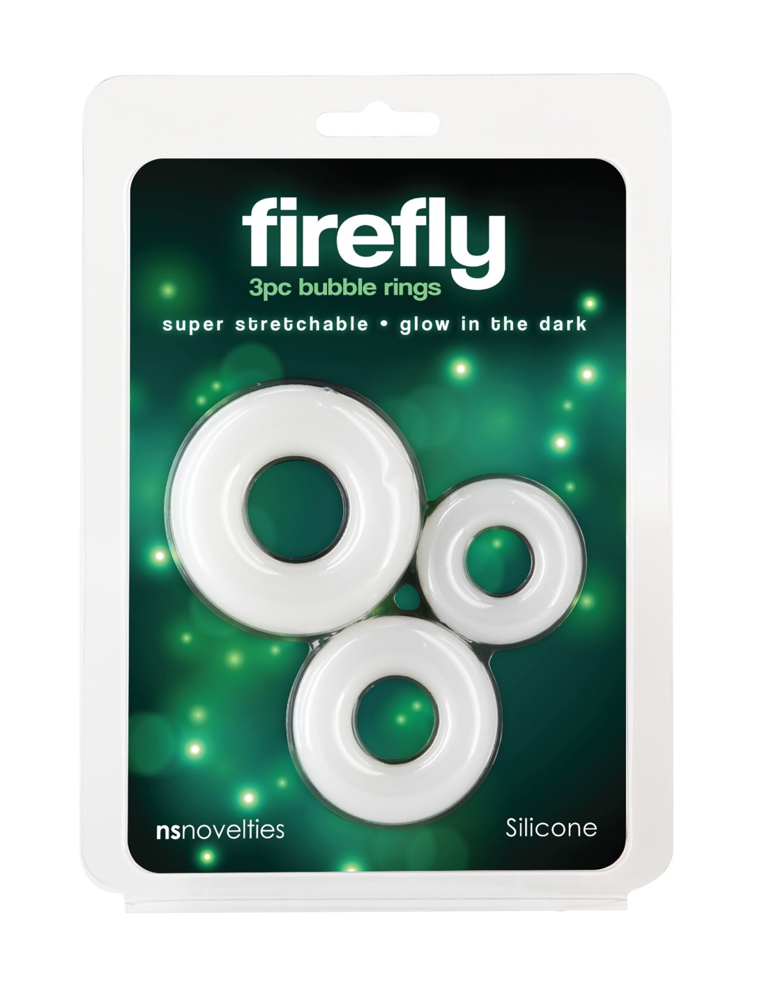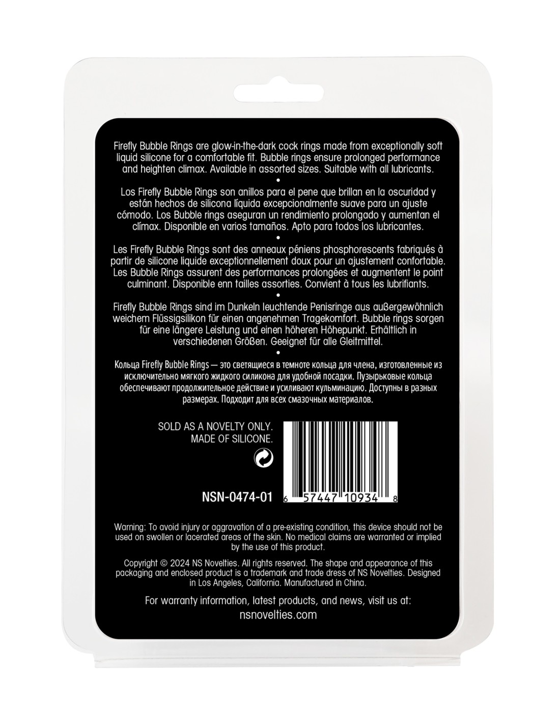 Firefly Bubble Rings son anillos para el pene que brillan en la oscuridad hechos de silicona líquida excepcionalmente suave para una fit cómoda. Los anillos de burbujas garantizan una performance prolongada y aumentan el clímax. Disponible en varios tamaños. Apto con todos los lubricantes.