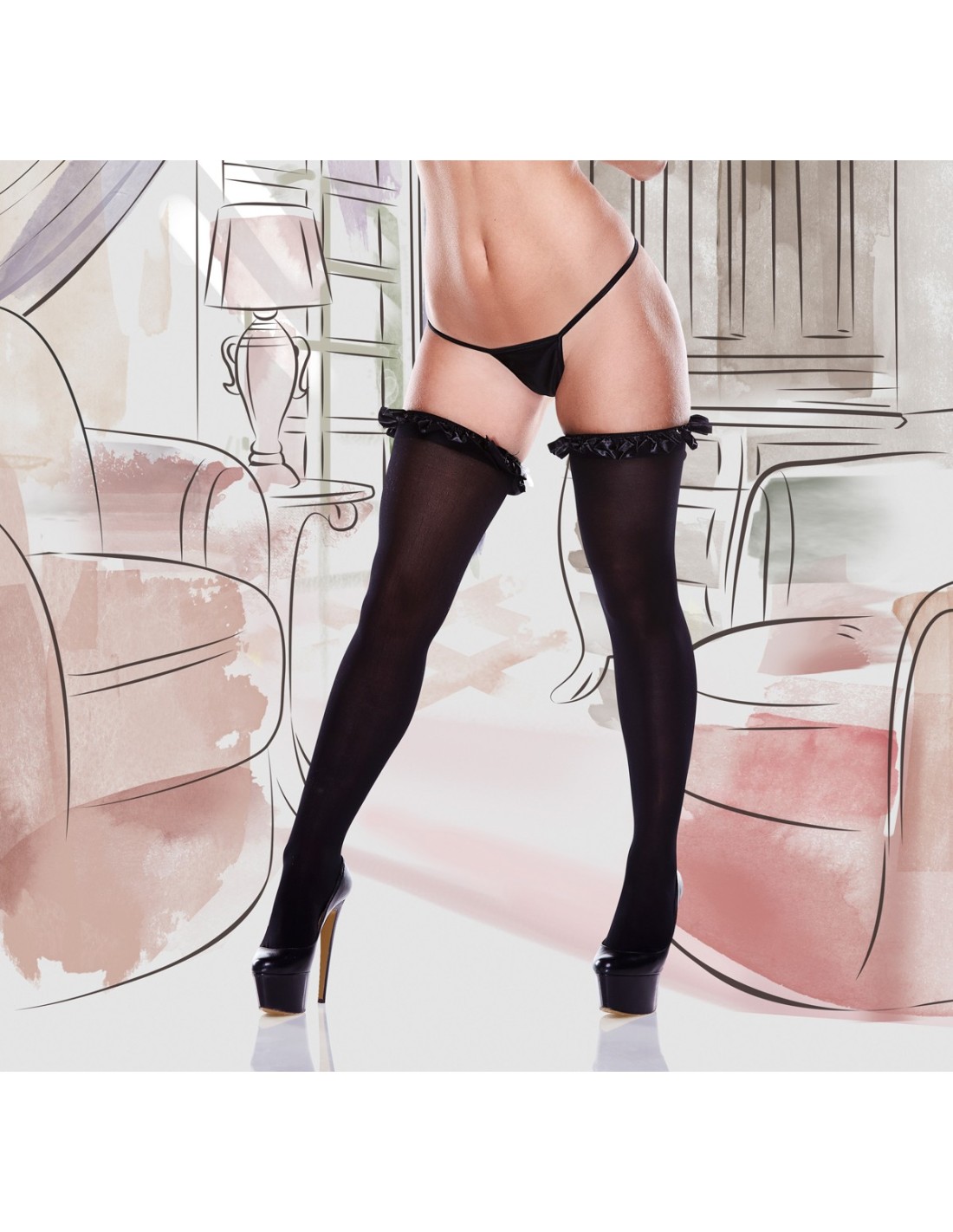 Medias hasta el muslo negras opacas con ribete de volantes y un lazo blanco en la costura trasera.