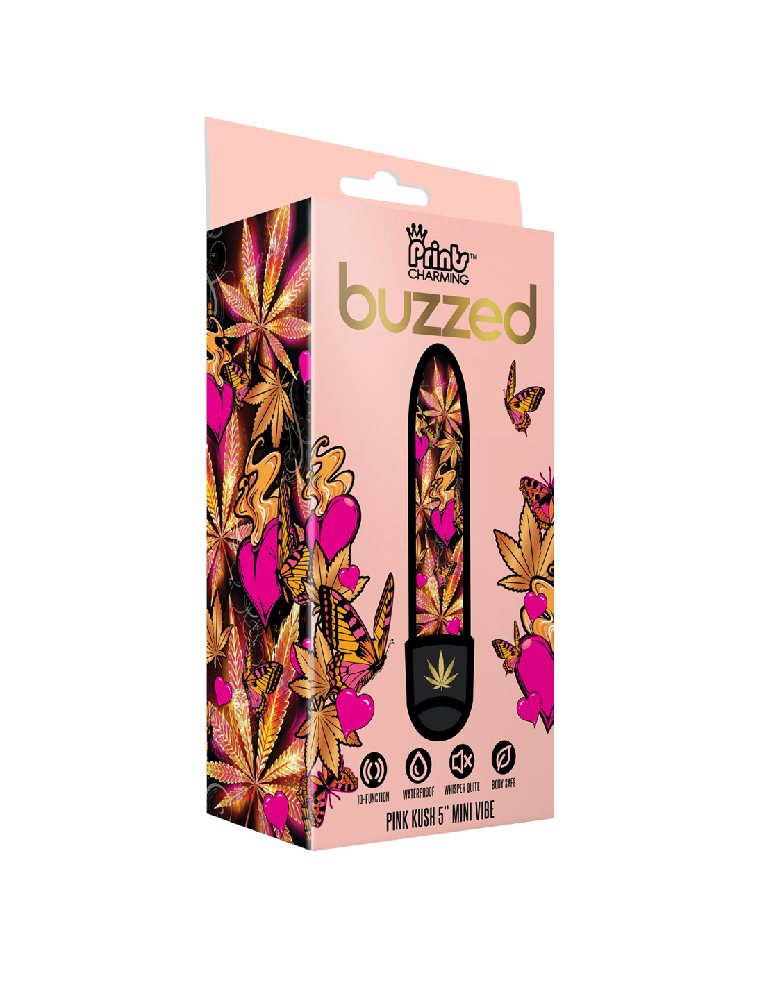 ¡Sube la potencia y lleva tu placer a un nivel completamente nuevo! Este mini vibrador clásico y suave de Pink Kush de la gama Prints Charming Buzzed tiene divertidos y vibrantes patrones de cannabis y 10 potentes funciones. Con un botón pulsador sencillo con incrustaciones de silicona y control LED iluminado. Para facilitar su uso y brindarle tranquilidad, es resistente al agua y silencioso, seguro para el cuerpo y libre de ftalatos. Viene con una bolsa de almacenamiento en un embalaje sin desperdicio.
