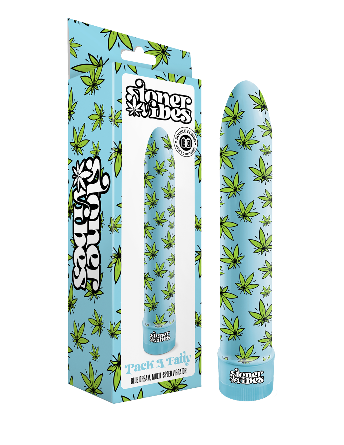 El vibrador Pack a Fatty con diseño de marihuana tiene una forma suave y resbaladiza que hace de este vibrador Blue Dream una experiencia verdaderamente alucinante. Potentes vibraciones de varias velocidades con una base de fácil giro para ajustar las velocidades. A prueba de salpicaduras, seguro para el cuerpo y libre de ftalatos. El vibrador utiliza 2 pilas C (no incluidas). Largo 20,3 cm y diámetro 3,8 cm. Compatible con cualquier lubricante personal. ¡Duerme, fuma, vibra y repite!