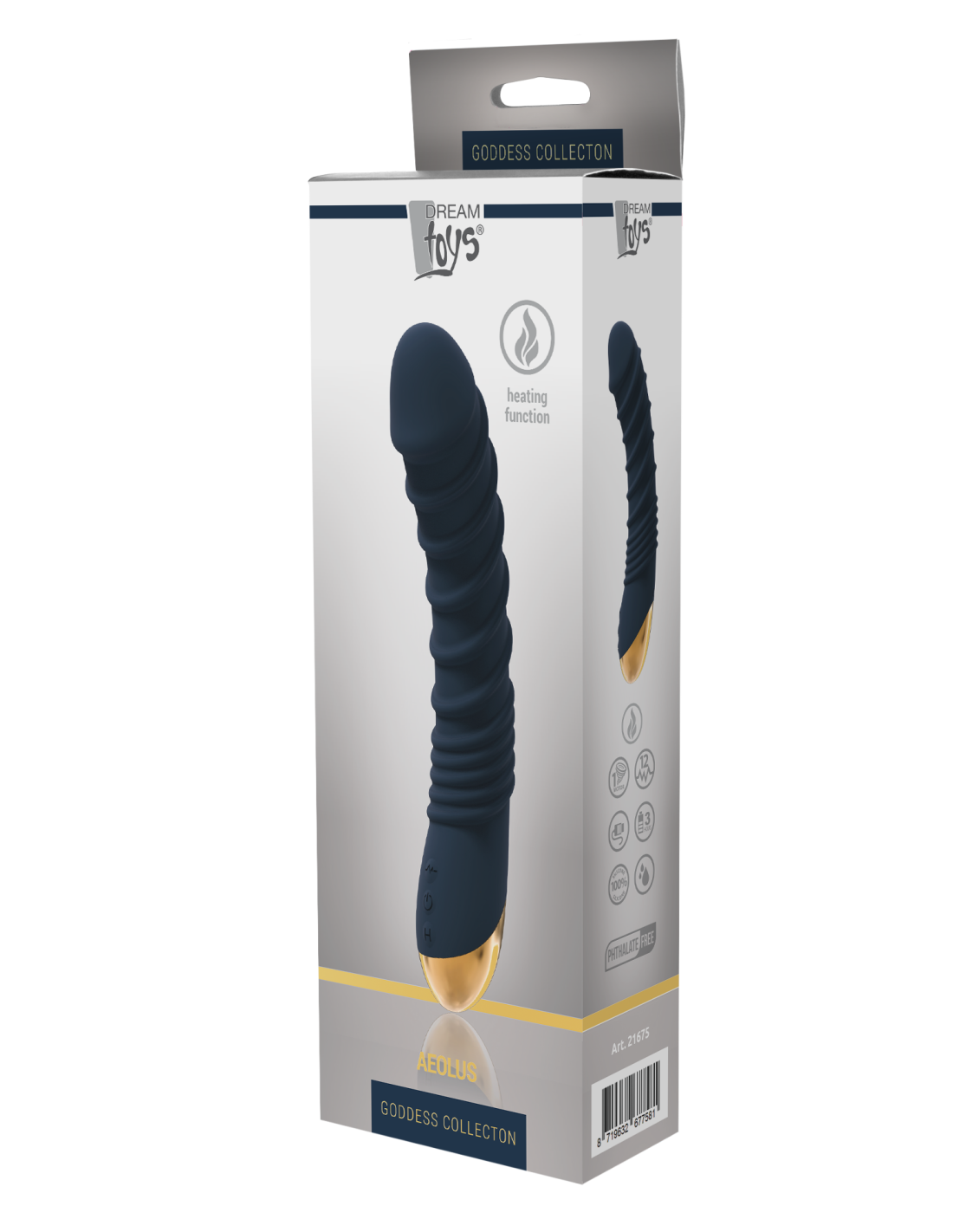 Este vibrador resistente al agua está hecho de silicona "líquida" segura para el cuerpo, lo que lo hace muy suave al tacto. Se siente como algo real. El potente motor ofrece 3 niveles de vibración constante y 9 ritmos diferentes. Las crestas del eje añaden estimulación adicional a la experiencia y la forma ligeramente curvada es perfecta para la estimulación del punto G. Una característica especial del Aeolus es la función de calentamiento en la parte superior, que calienta el vibrador hasta la temperatura corporal.