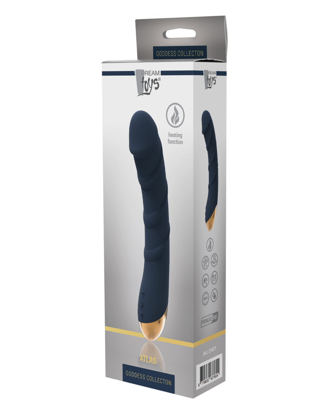 Este vibrador resistente al agua está hecho de silicona "líquida" segura para el cuerpo, lo que lo hace muy suave al tacto. Se siente como algo real. El potente motor ofrece 3 niveles de vibración constante y 9 ritmos diferentes. Las crestas adicionales en el eje debajo del glande añaden estimulación adicional a la experiencia y la forma ligeramente curvada es perfecta para la estimulación del punto G. Una característica especial del Atlas es la función de calentamiento en la parte superior, que calienta el vibrador hasta la temperatura corporal.