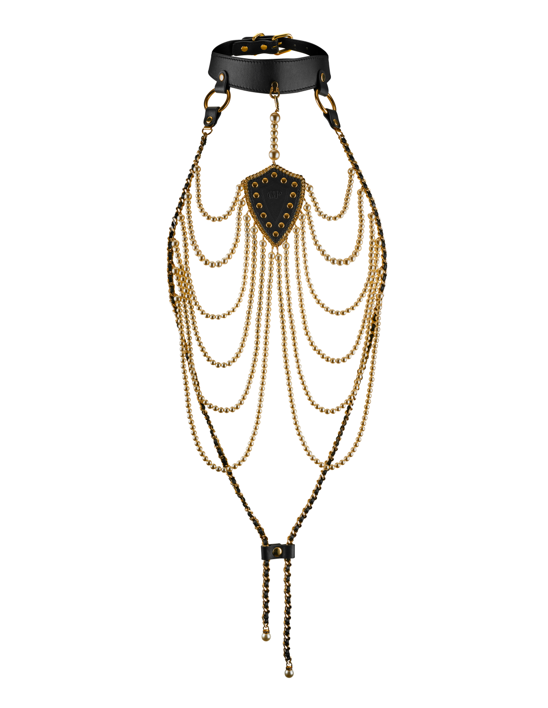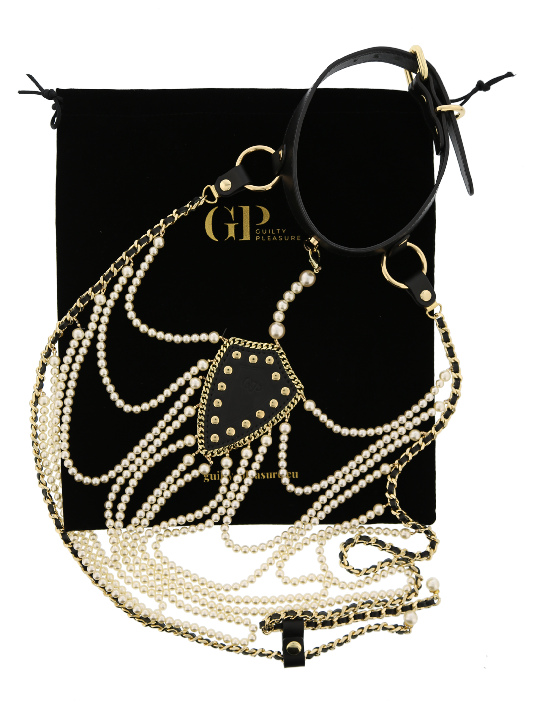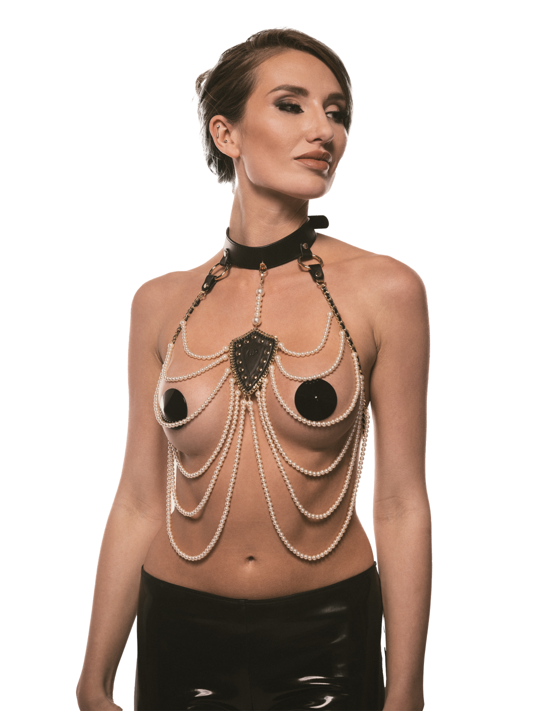 El Pearl Pleasure Collar es un accesorio visualmente impactante diseñado para combinar la elegancia con la expresión erótica. Combinando la estética de la moda con la funcionalidad íntima, este cuello ajustable cuenta con cuero vegano suave combinado con hebras de perlas en cascada y detalles en tonos dorados, creando una apariencia lujosa que cambia a la perfección entre el uso sensual y el estilo provocativo.