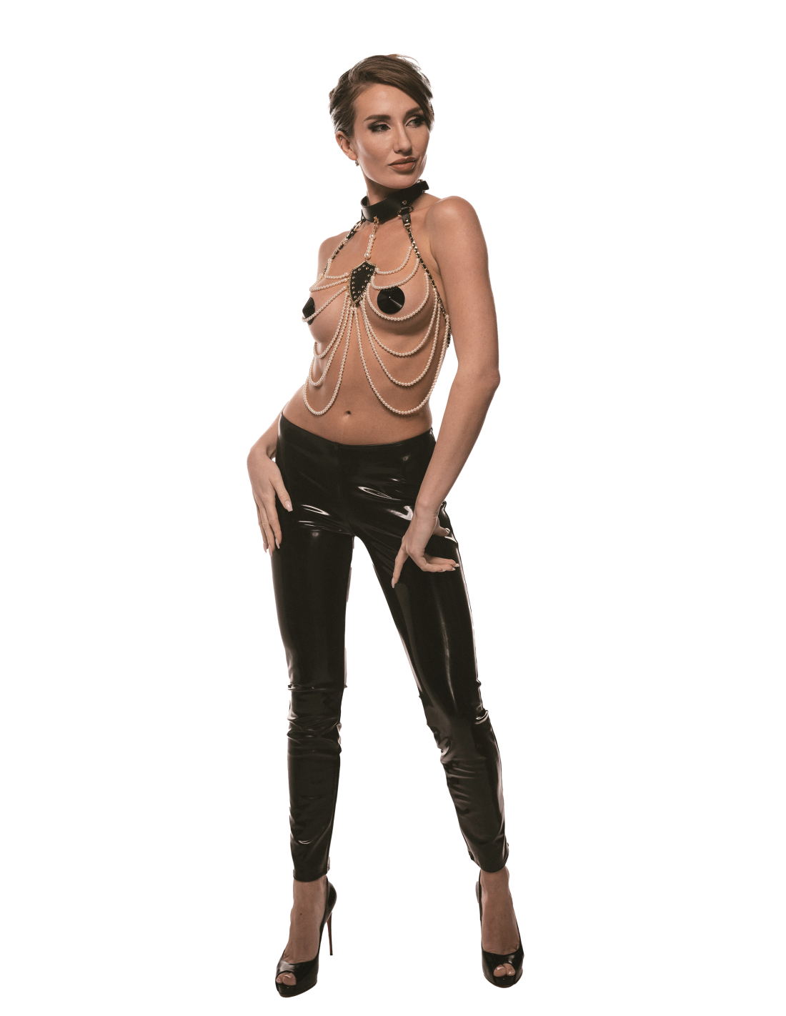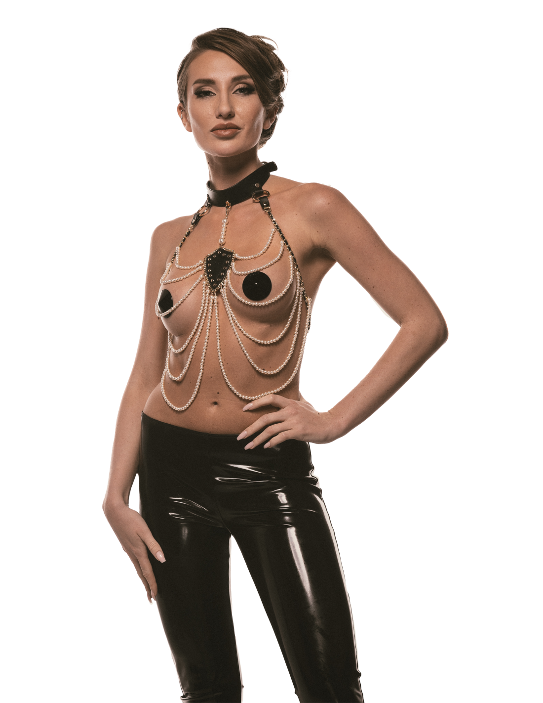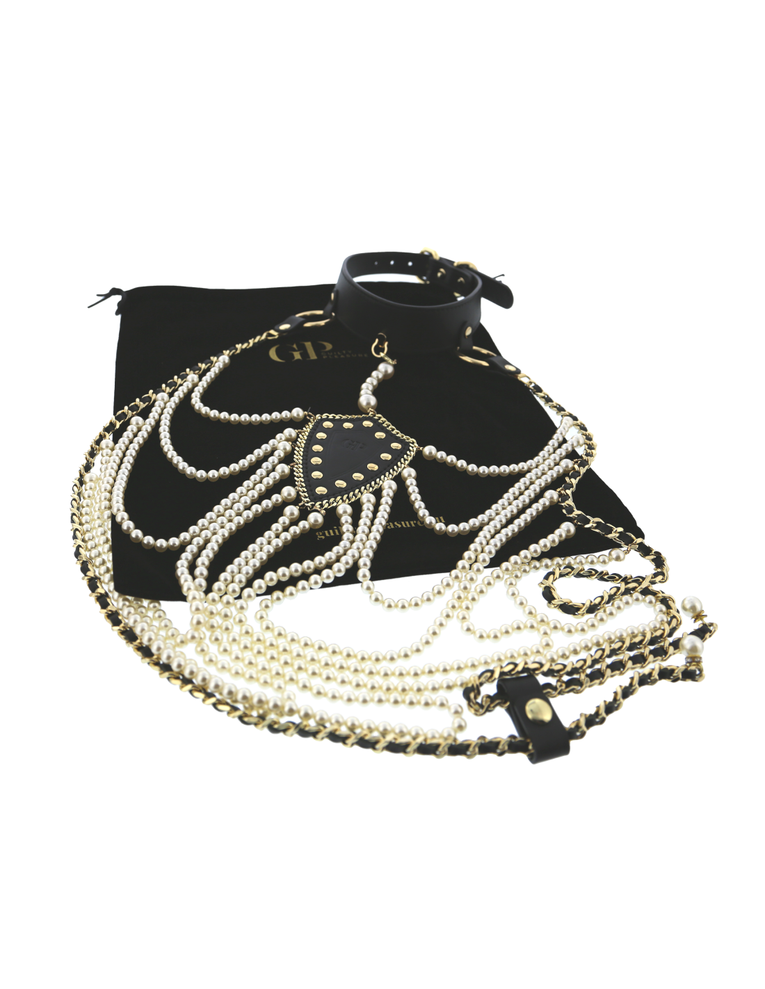 Diseñado para brindar comodidad y encanto, el collar se ajusta suavemente alrededor del cuello y es totalmente ajustable para un fit seguro pero cómodo. Las cadenas de perlas son ligeras y fluidas, diseñadas para moverse con gracia con el cuerpo, mejorando el atractivo visual durante el juego íntimo o en capas con prendas de abrigo para un estilo atrevido. Los herrajes dorados completan el acabado de alta gama, ofreciendo una presentación refinada y exclusiva.
