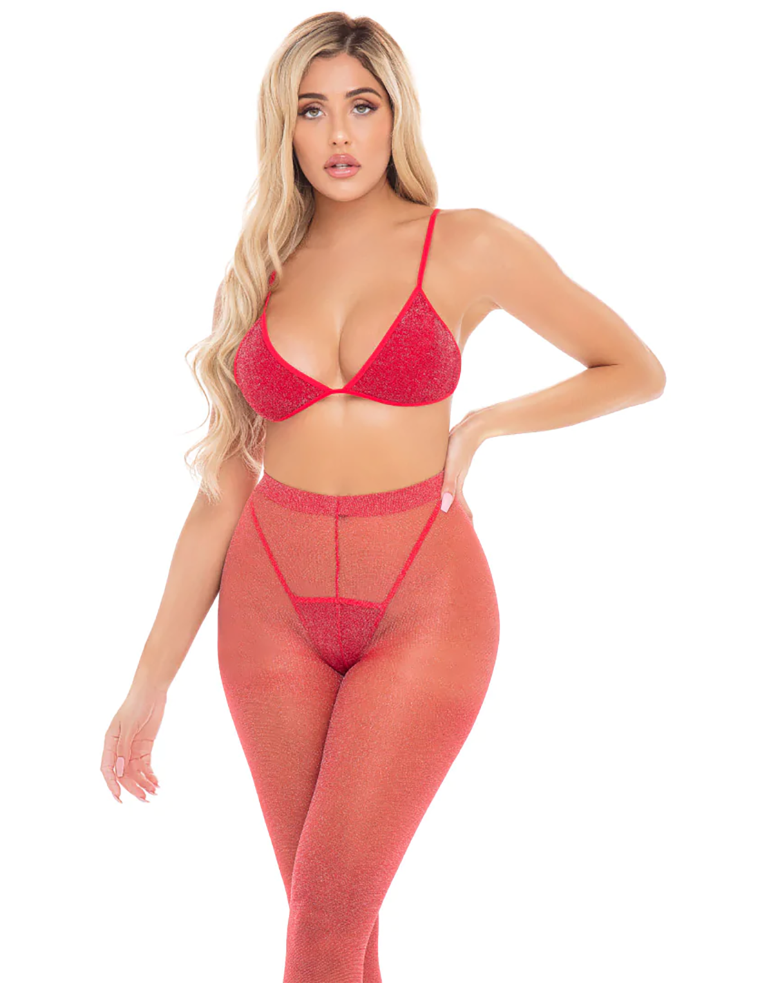Tanto el sujetador como el tanga deslumbran con una estética glamurosa y brillante. Como guinda del pastel, los leggings transparentes de cintura alta ayudan a unir todo en un conjunto sexy.