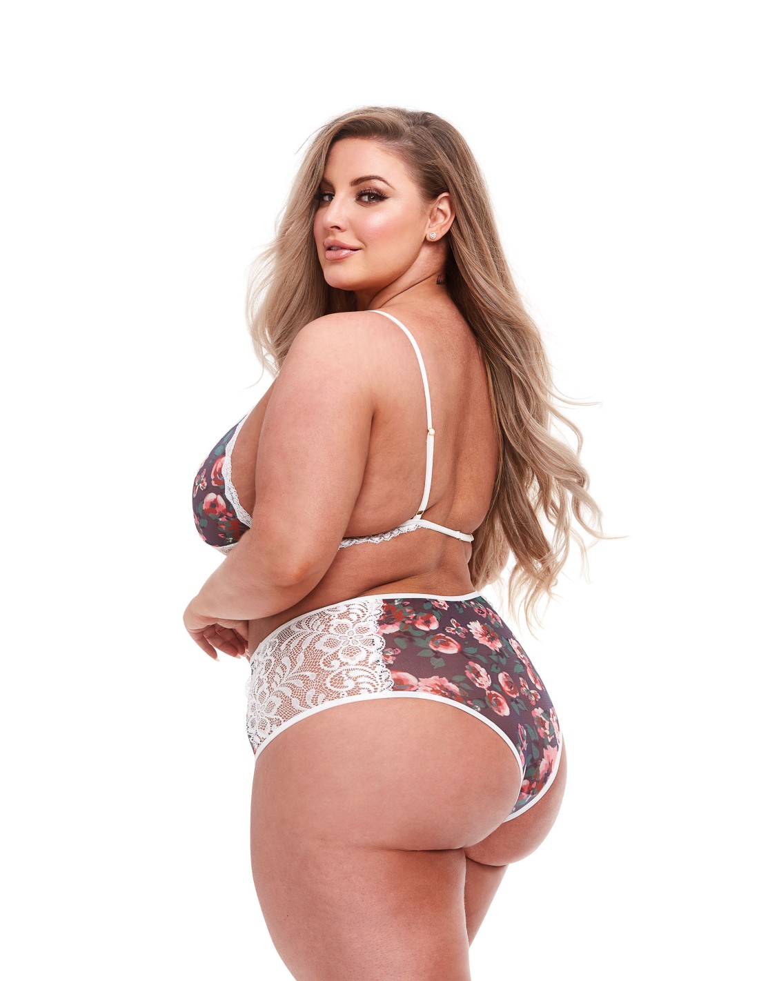 El diseño vintage se combina con las características modernas y sexys de hoy en este impresionante conjunto de dos piezas con flores oscuras. El bralette presenta un diseño de tirantes delgados con una banda ancha de encaje blanco en contraste, mientras que las braguitas atrevidas y de cintura alta a juego presentan paneles de delicado encaje a juego.