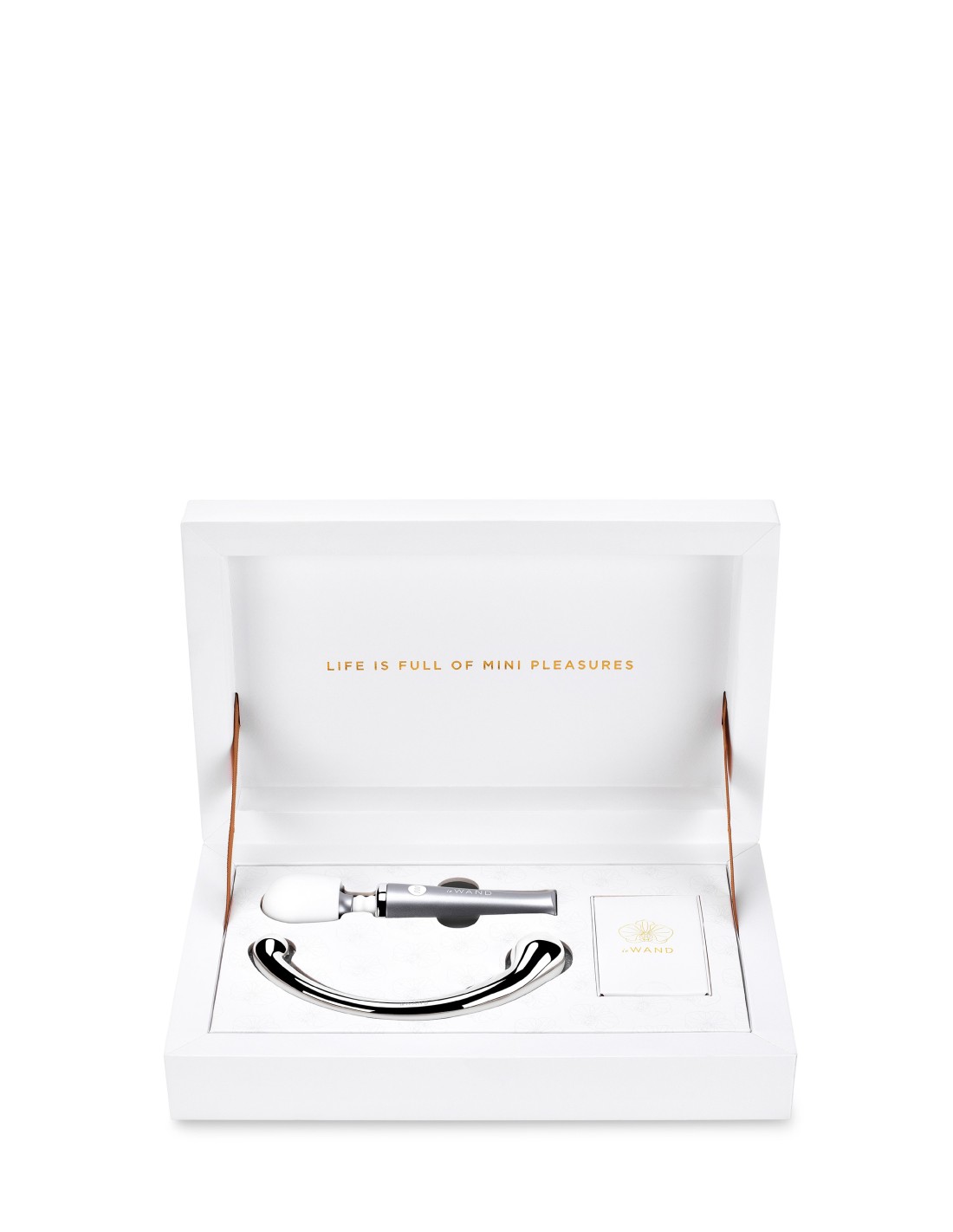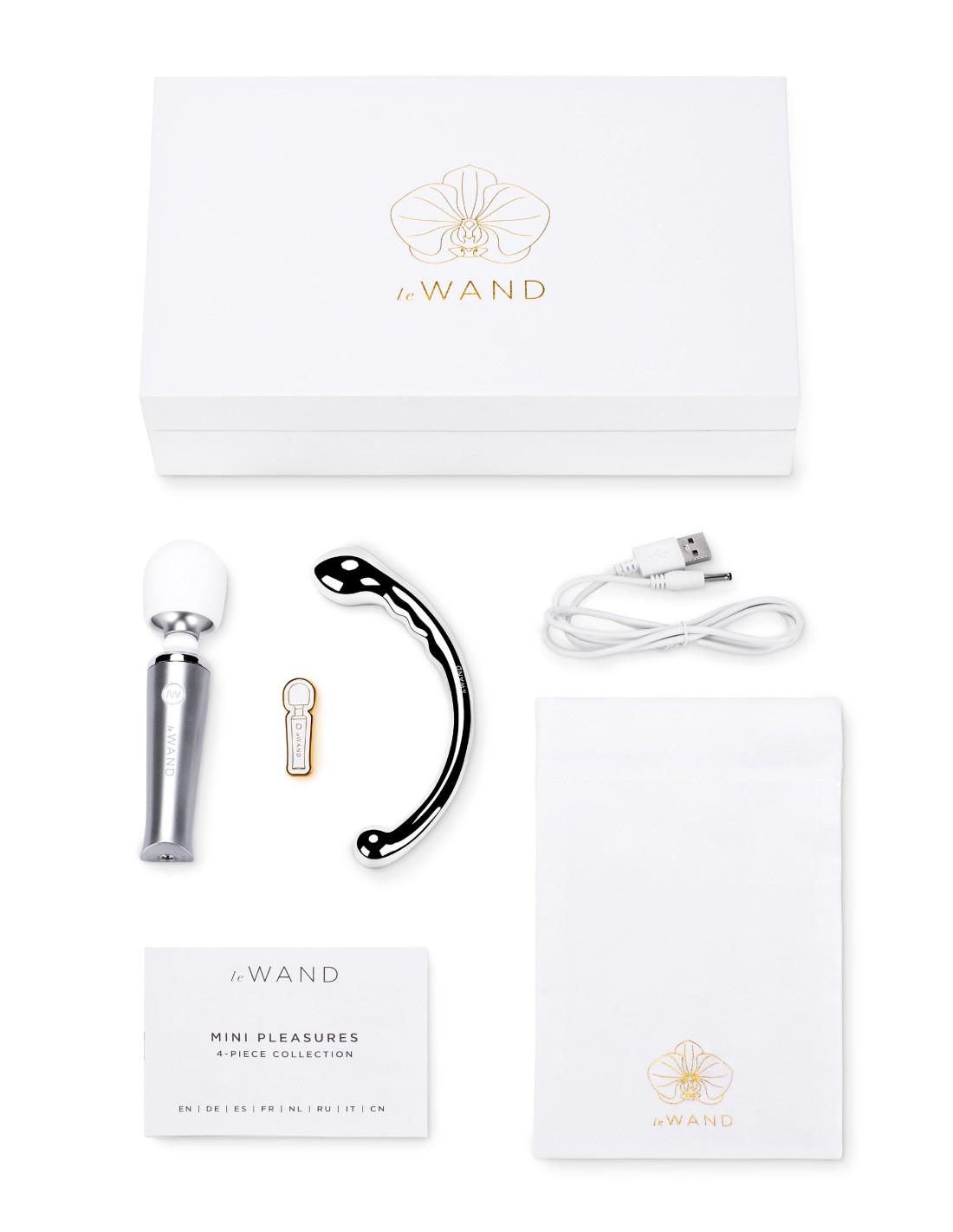 Colección LE WAND Mini Pleasures de 4 piezas. LE WAND Mini Pleasures Set presenta versiones más pequeñas y perfectamente regalables de dos de nuestros productos más codiciados. Se incluye un mini vibrador versátil que demuestra que una gran potencia puede venir en paquetes pequeños y una versión pequeña de nuestra herramienta de placer de acero inoxidable de doble extremo que está perfectamente curvada para la estimulación del punto G. Ideal para principiantes, Mini Pleasures es un conjunto elegante y con estilo diseñado para estimular todas tus zonas erógenas.