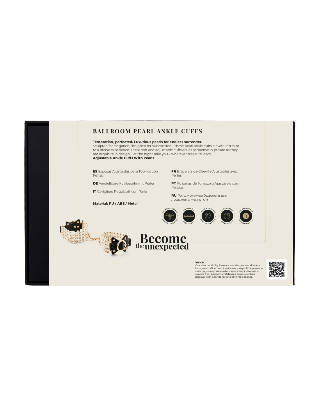 Los puños de tobillo Ballroom Pearl combinan un estilo elegante con una moderación funcional, ofreciendo un accesorio de alta gama que combina moda, fantasía y comodidad. Confeccionados con suave cuero vegano, radiant hebras de perlas falsas y terminados con herrajes dorados, estos puños están diseñados para cautivar tanto visual como sensualmente.