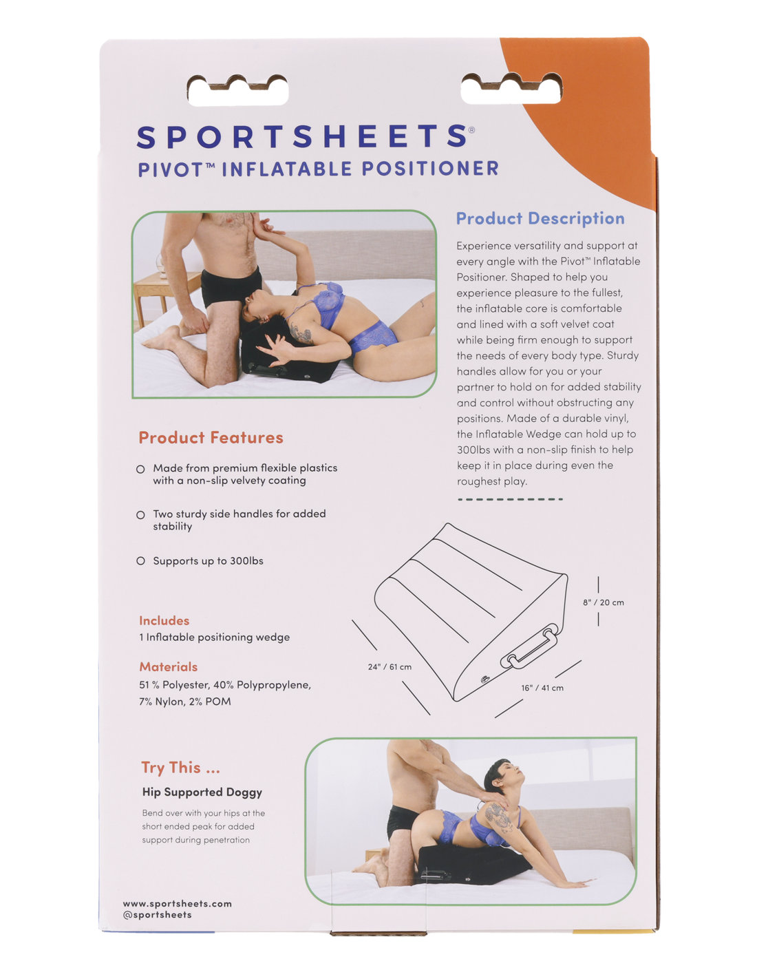 Experimente versatilidad y soporte en todos los ángulos con el posicionador inflable Pivot™. Diseñado para ayudarle a experimentar el placer al máximo, el núcleo inflable es cómodo y está forrado con una suave capa de terciopelo, a la vez que es lo suficientemente firme para satisfacer las necesidades de cada tipo de cuerpo. Los mangos resistentes le permiten a usted o a su pareja sostenerse para mayor estabilidad y control sin obstruir ninguna posición. Hecho de un vinilo duradero, el posicionador inflable puede soportar hasta 300 libras (136 kg) con un acabado antideslizante para ayudar a mantenerlo en su lugar incluso durante el juego más duro.