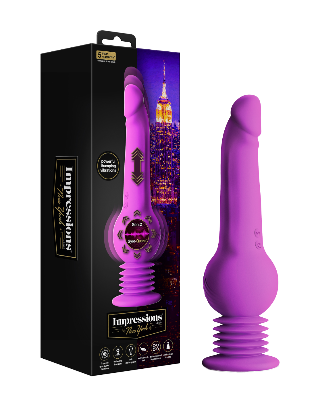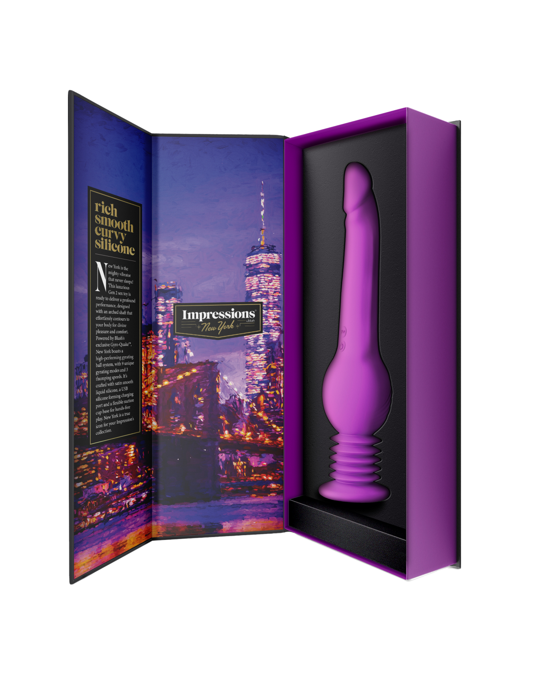 ¡Viaja a la ciudad más grande del mundo con Impressions Nueva York! Este lujoso consolador está listo para impresionar bajo las luces más brillantes. New York está diseñada para performance alta con Gen 2 Gyro-Quake™ Ultra Deep Rumbly Thumping que emana de la base, habilitado por su innovador sistema de bolas giratorias de última generación. Siente la euforia del shaft con sus 3 velocidades de golpeteo y giro, combinadas con 9 potentes modos de vibración que traerán olas interminables de placer como la ciudad que nunca duerme. La shaft arqueada se adapta a tu cuerpo para una comodidad divina, hecha con silicona curada con platino que se siente increíblemente suave y satinada en tu piel. La base de ventosa estilo acordeón produce movimientos más auténticos para un juego mejorado con manos libres. New York es resistente al agua IPX7, lo que lo hace totalmente sumergible, perfect para jugar en el baño y la ducha. Con un avanzado puerto de carga USB de silicona, este consolador está listo para una aventura ininterrumpida durante todo el día. Nueva York es un verdadero icono para la colección de tu Impression.
