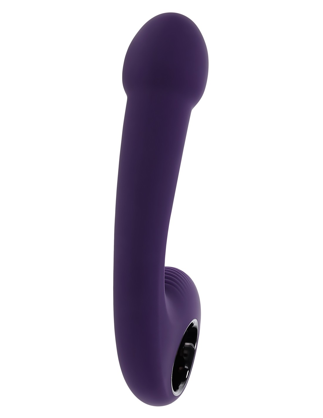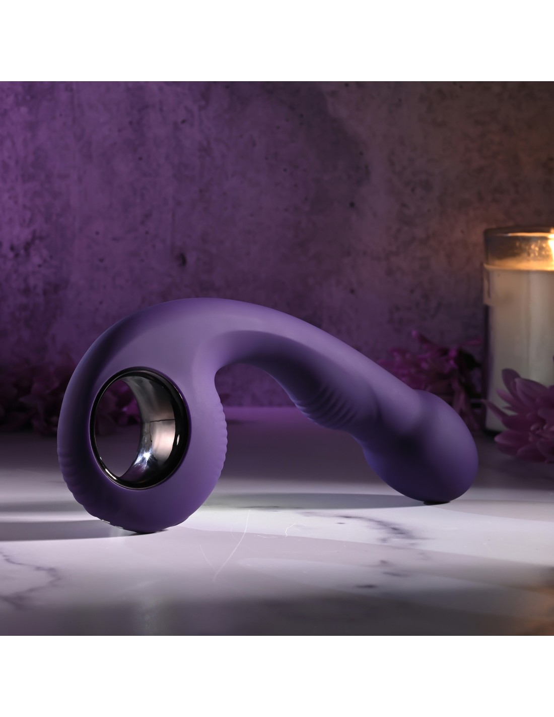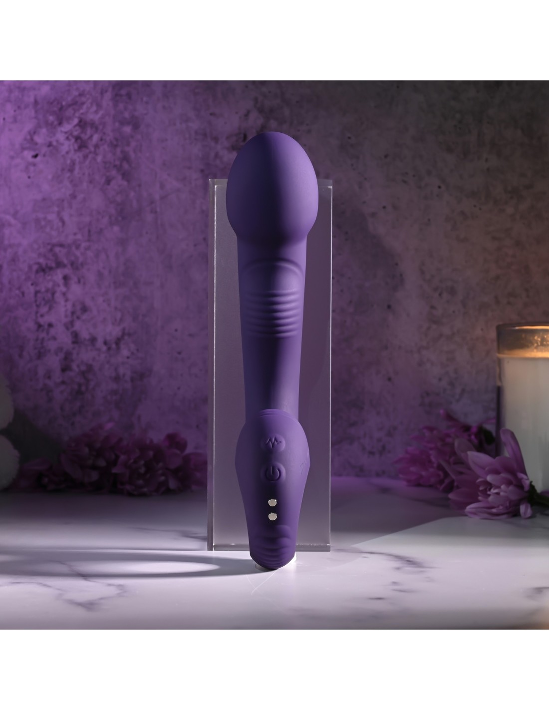 Este potente vibrador cuenta con un mango texturizado y anillado para una navegación cómoda con un agarre firme. Dos motores controlados de forma independiente emiten vibraciones de varias velocidades tanto en la cabeza bulbosa con corona como en la base de seguridad anillada, que es flexible en el vástago para moverse con el cuerpo.
