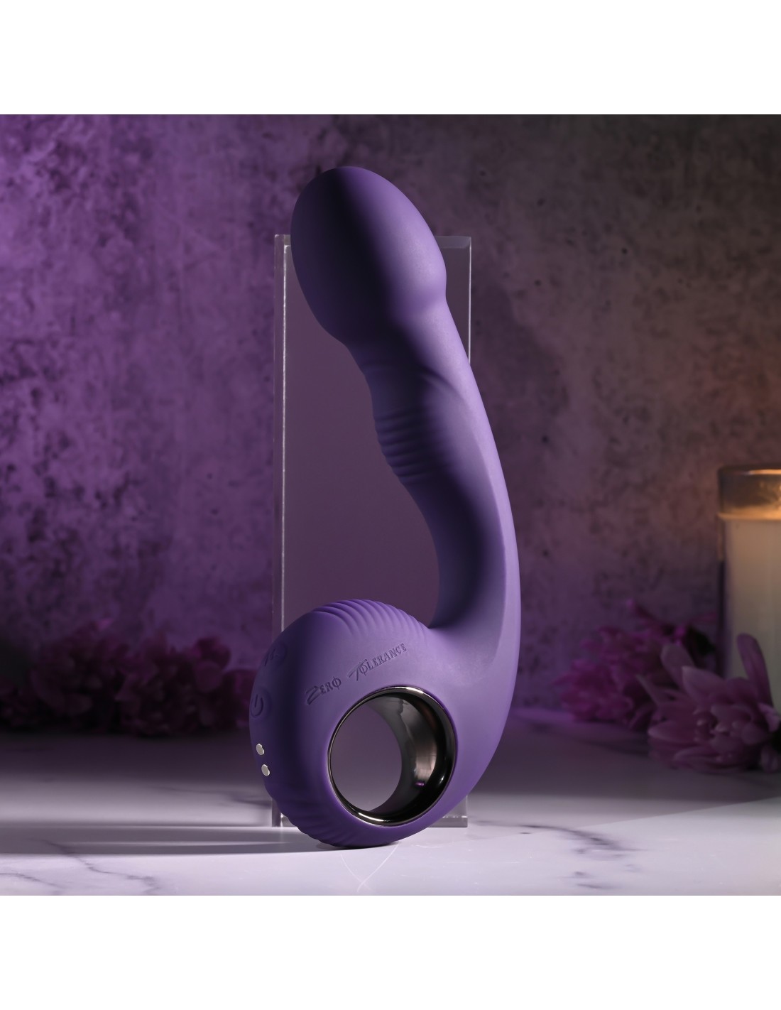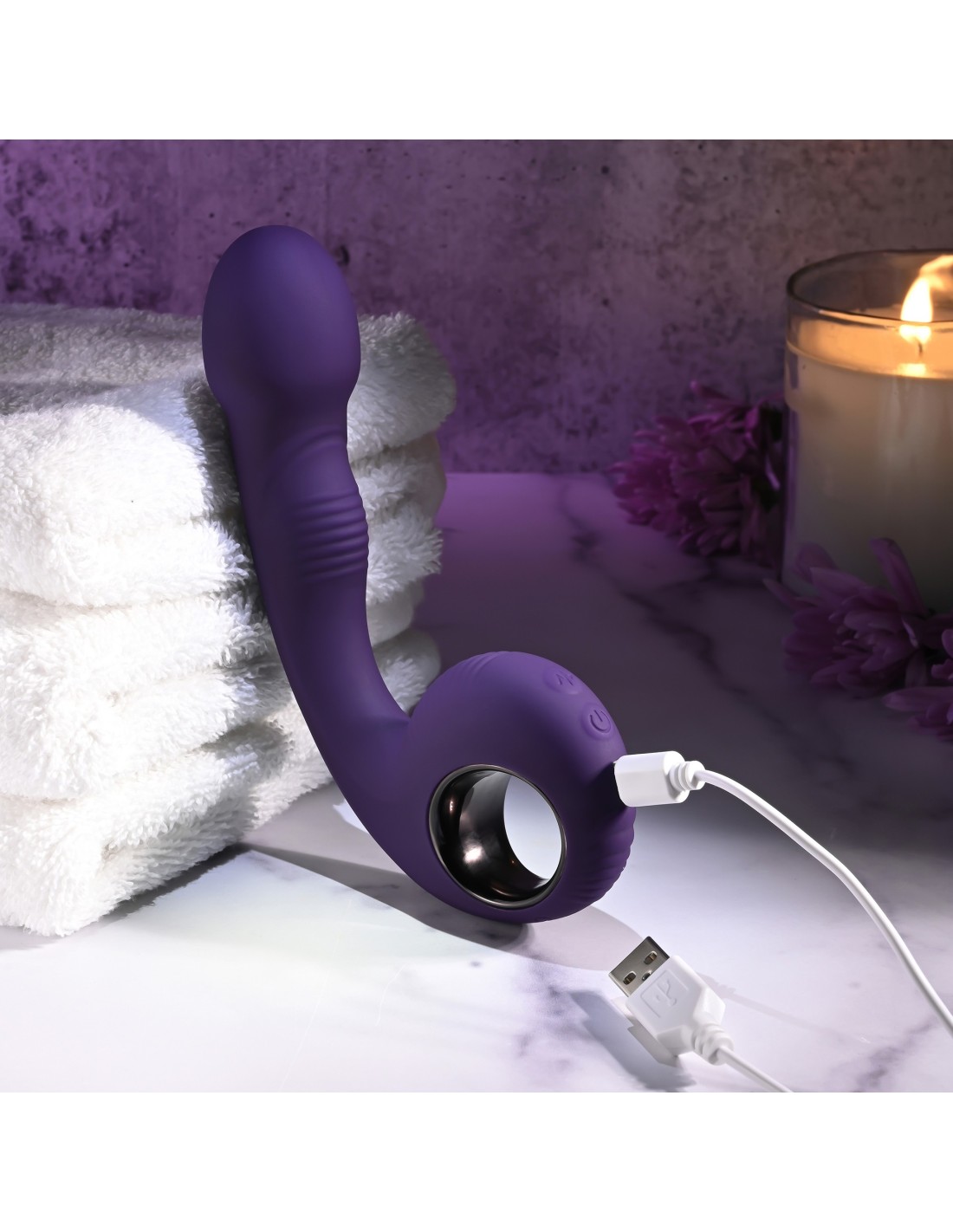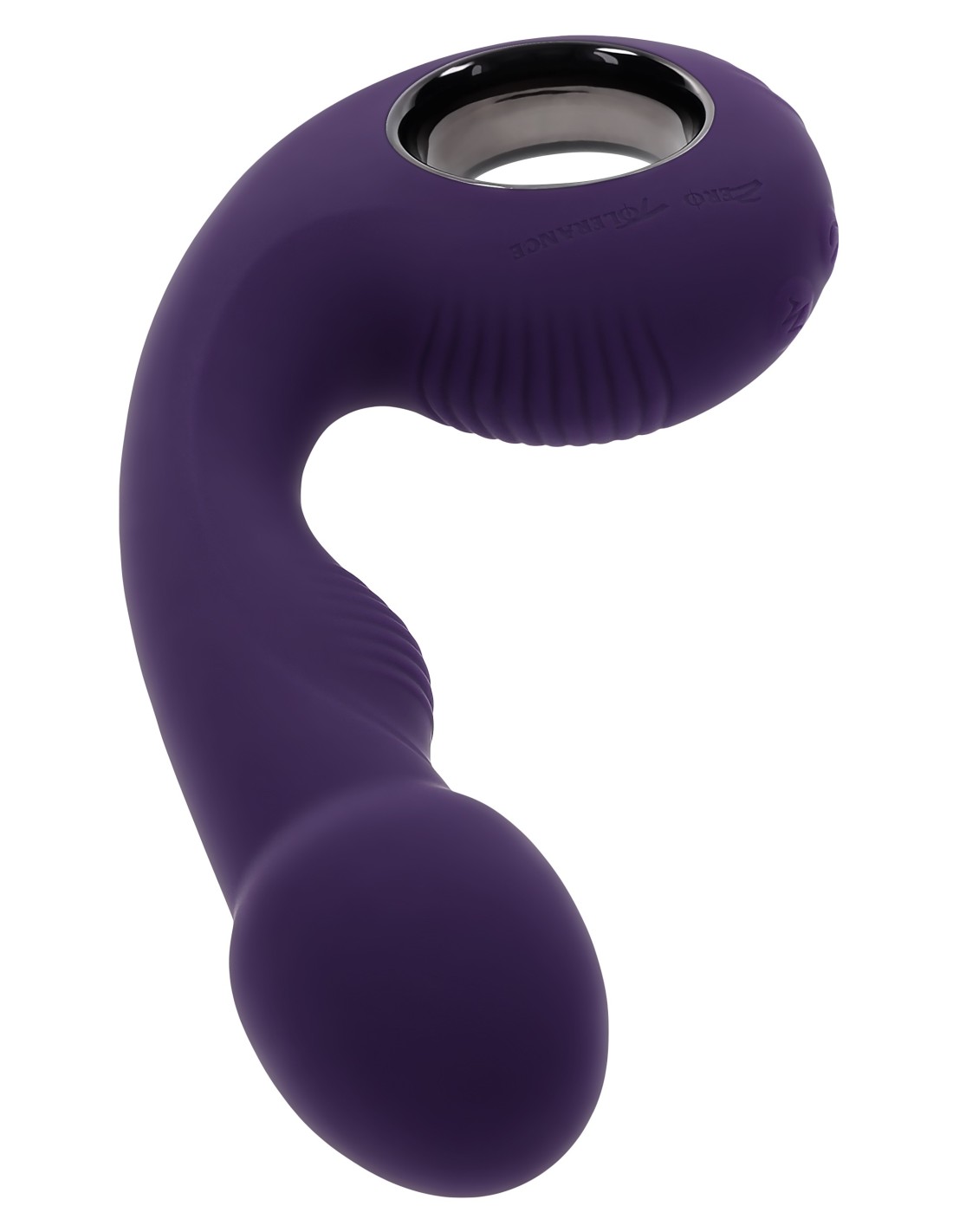 Este potente vibrador cuenta con un mango texturizado y anillado para una navegación cómoda con un agarre firme. Dos motores controlados de forma independiente emiten vibraciones de varias velocidades tanto en la cabeza bulbosa con corona como en la base de seguridad anillada, que es flexible en el vástago para moverse con el cuerpo.