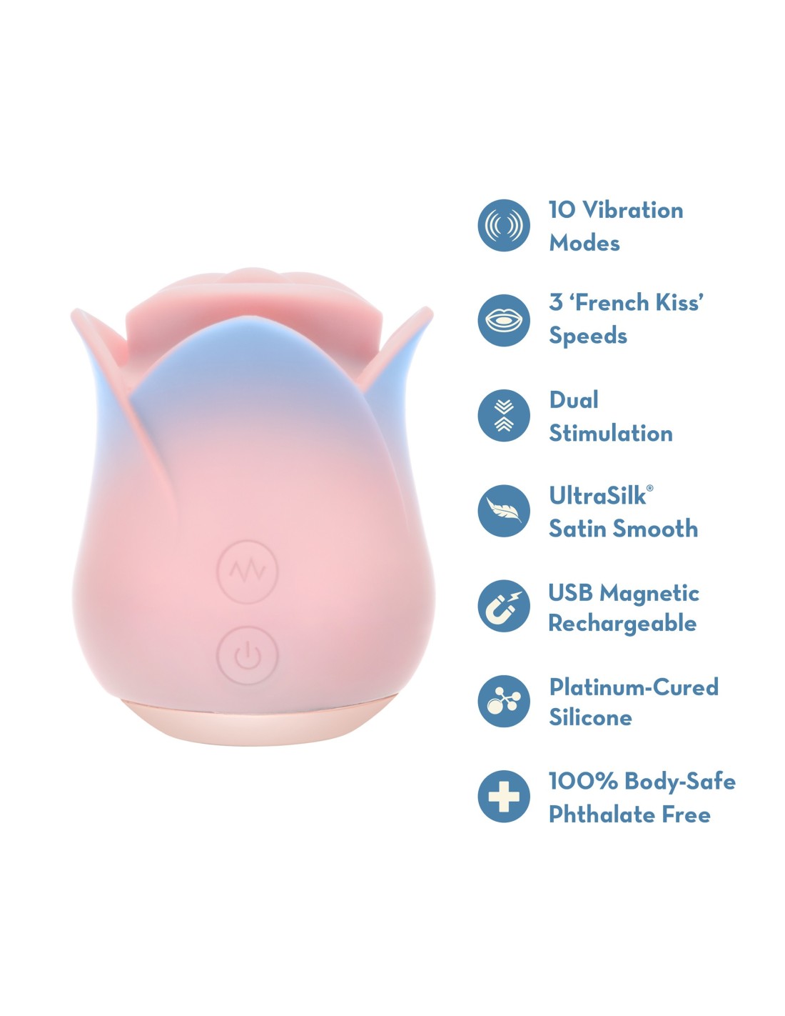 Inspirado en romance y diseñado para la indulgencia, el Kissing Rose de la Colección Blush te invita a explorar un placer profundo y personalizable. Este elegante vibrador de clítoris cuenta con 10 modos de vibración (3 velocidades y 7 patrones) y 3 configuraciones sensuales de 'French Kiss' que imitan el movimiento suave y rítmico de la lengua de un amante. Deje que la estimulación aumente la excitación con cada movimiento suave y burlón, calentamiento, borde o disfrute de un clímax lento y satisfactorio. Hecho de silicona 100% segura para el cuerpo con un acabado UltraSilk® suave, el Kissing Rose está diseñado para la comodidad, la belleza y el placer. Las crestas esculpidas en forma de pétalos agregan un toque texturizado que realza cada pulso y movimiento, rodeándote con una sensación suave y en capas. Compacto, a prueba de salpicaduras y recargable por USB magnético, se adapta perfectamente a su rutina de cuidado personal y es fácil de usar, limpiar y almacenar. Deja que tu placer se desarrolle, beso a beso.