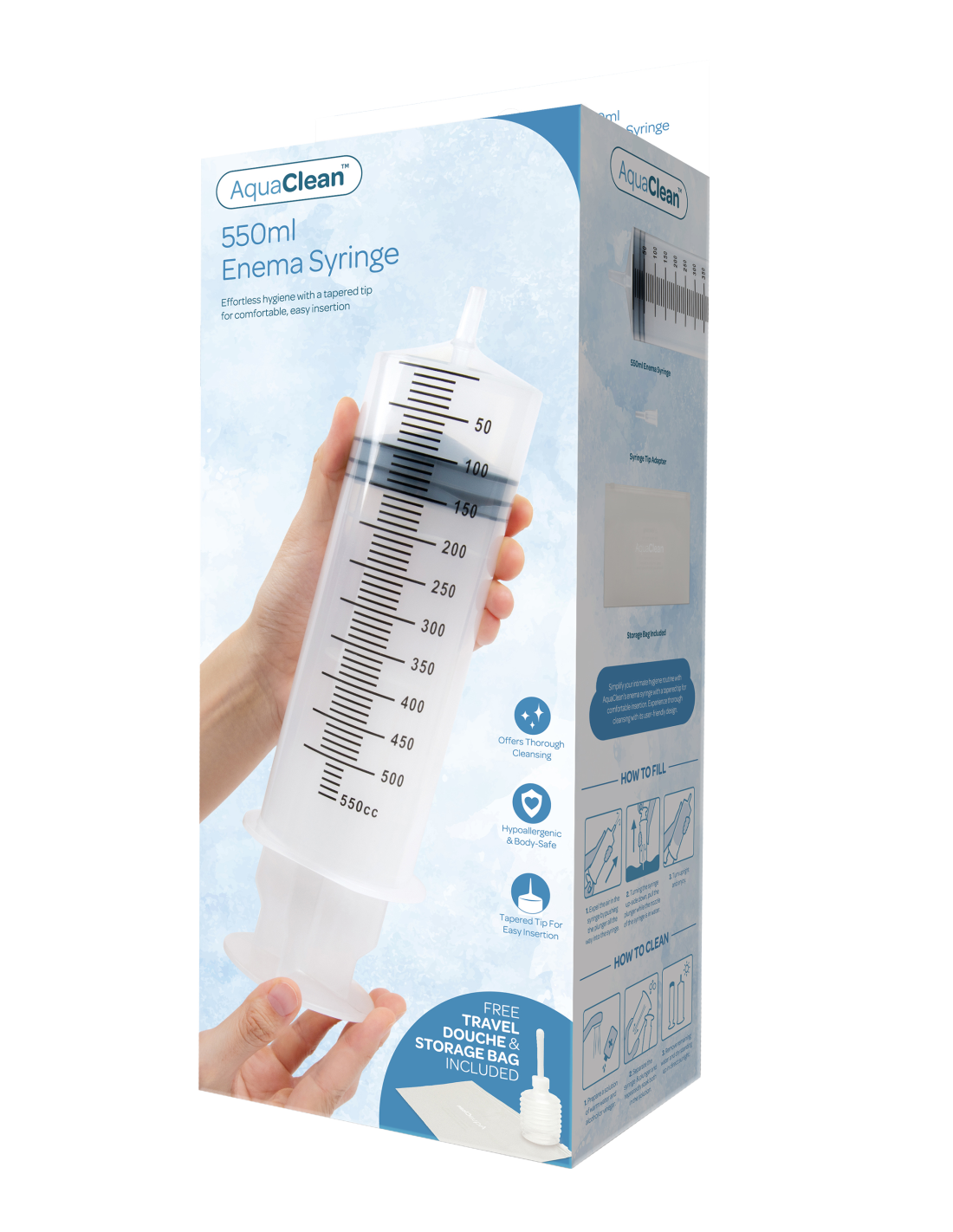 AquaClean facilita la higiene íntima con esta jeringa de enema con una punta cónica para una fácil inserción. Prioriza tu higiene con una solución sencilla y eficaz diseñada para tu máxima comodidad y limpieza. La jeringa tiene capacidad para hasta 18.5 onzas líquidas (550 ml) y el juego también incluye una ducha vaginal compacta y fácil de transportar y una bolsa de almacenamiento para limpiar sobre la marcha.