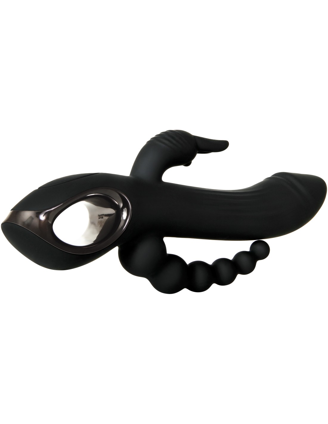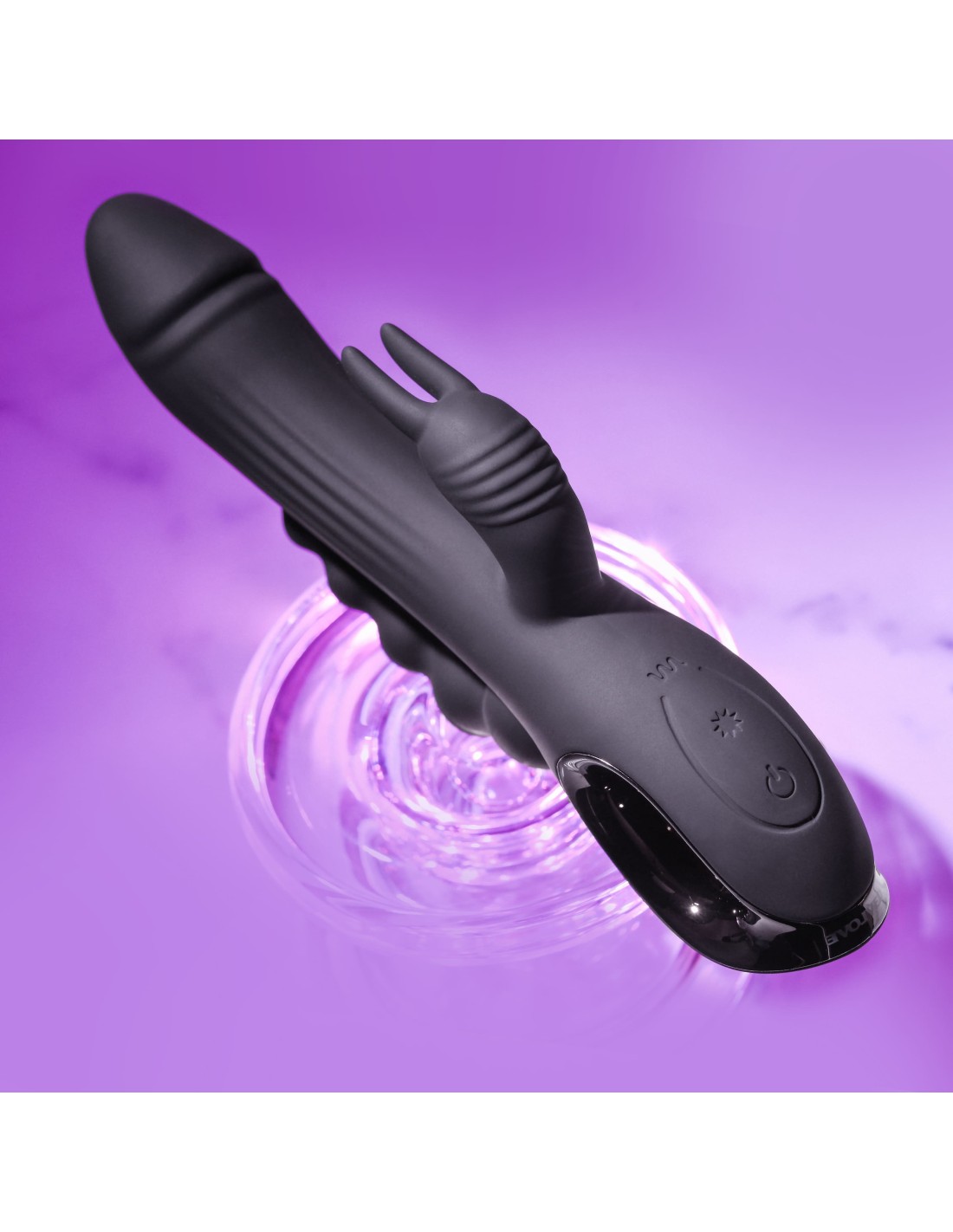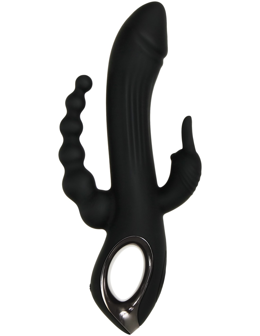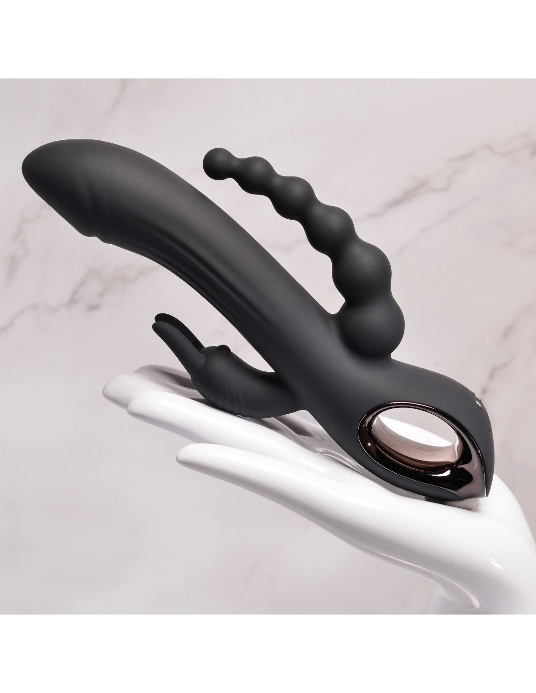 Descubra el orgasmo más intenso y profundamente satisfactorio posible: ¡el TRIGASMO! Estimula tres zonas erógenas a la vez para experimentar un placer de otro mundo que dejará tus rodillas débiles. El eje principal realista con forma fálica ofrece poderosas vibraciones internas mientras que el estimulador del clítoris hace vibrar tu zona de clímax con orejas de conejo trabajadoras. Mientras tanto, el eje anal con cuentas se desliza suave y gradualmente dentro de tu puerta trasera para completar la tentadora trifecta de placer. Encuentra el ritmo adecuado a tu gusto único, disfruta de tres motores en total y explora tu trigasmo en el baño o la ducha, ya que es completamente sumergible en agua. Limpiar con limpiador de juguetes y enjuague con agua caliente.