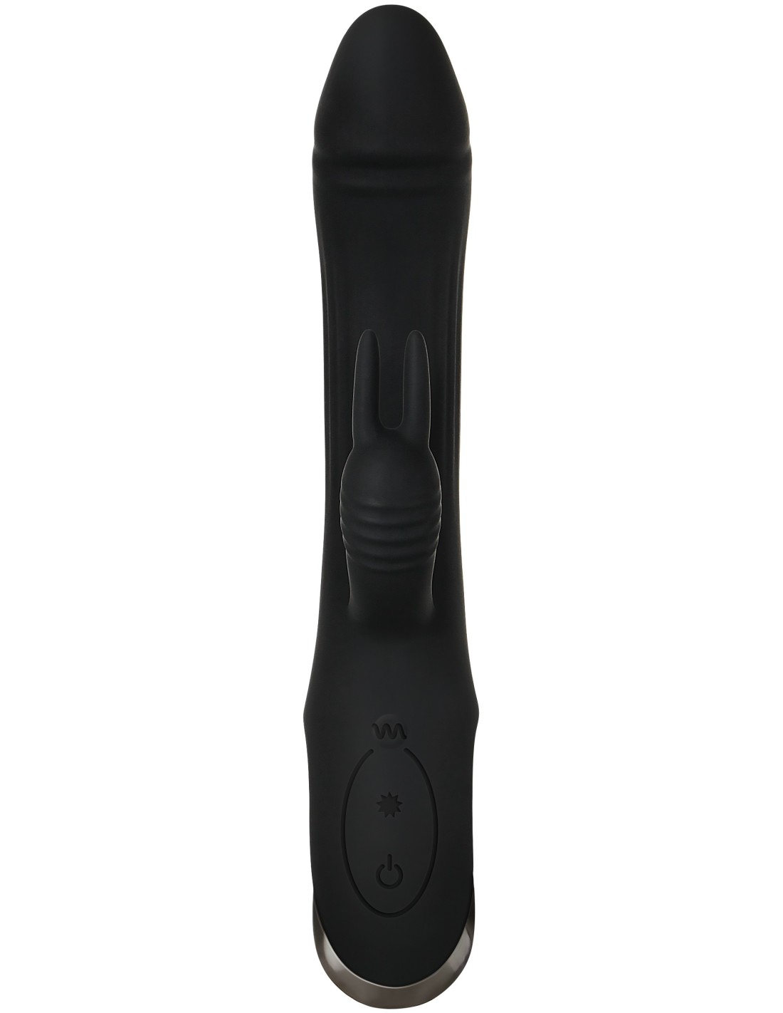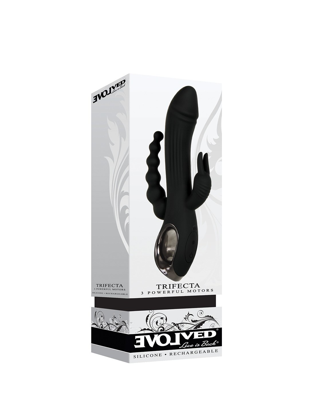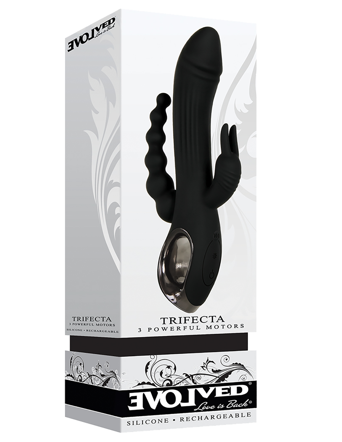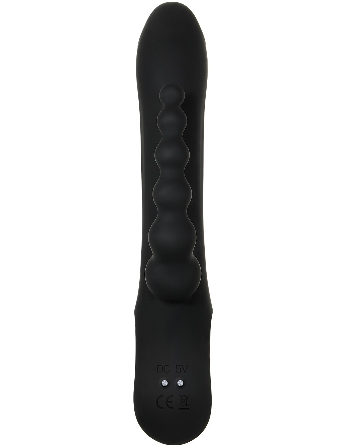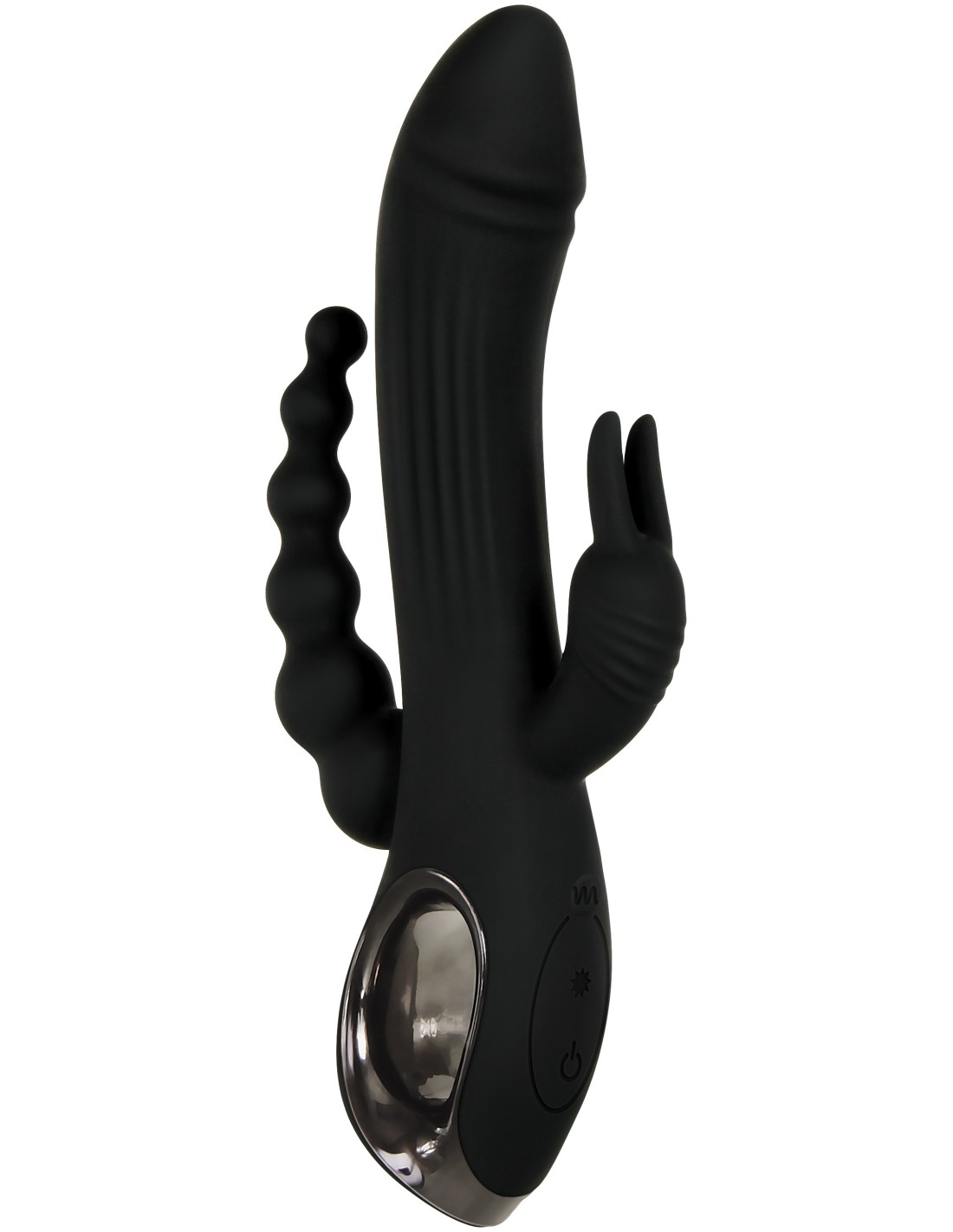 Descubra el orgasmo más intenso y profundamente satisfactorio posible: ¡el TRIGASMO! Estimula tres zonas erógenas a la vez para experimentar un placer de otro mundo que dejará tus rodillas débiles. El eje principal realista con forma fálica ofrece poderosas vibraciones internas mientras que el estimulador del clítoris hace vibrar tu zona de clímax con orejas de conejo trabajadoras. Mientras tanto, el eje anal con cuentas se desliza suave y gradualmente dentro de tu puerta trasera para completar la tentadora trifecta de placer. Encuentra el ritmo adecuado a tu gusto único, disfruta de tres motores en total y explora tu trigasmo en el baño o la ducha, ya que es completamente sumergible en agua. Limpiar con limpiador de juguetes y enjuague con agua caliente.