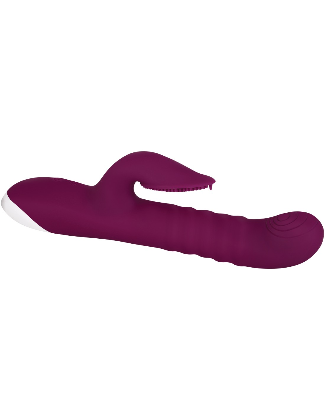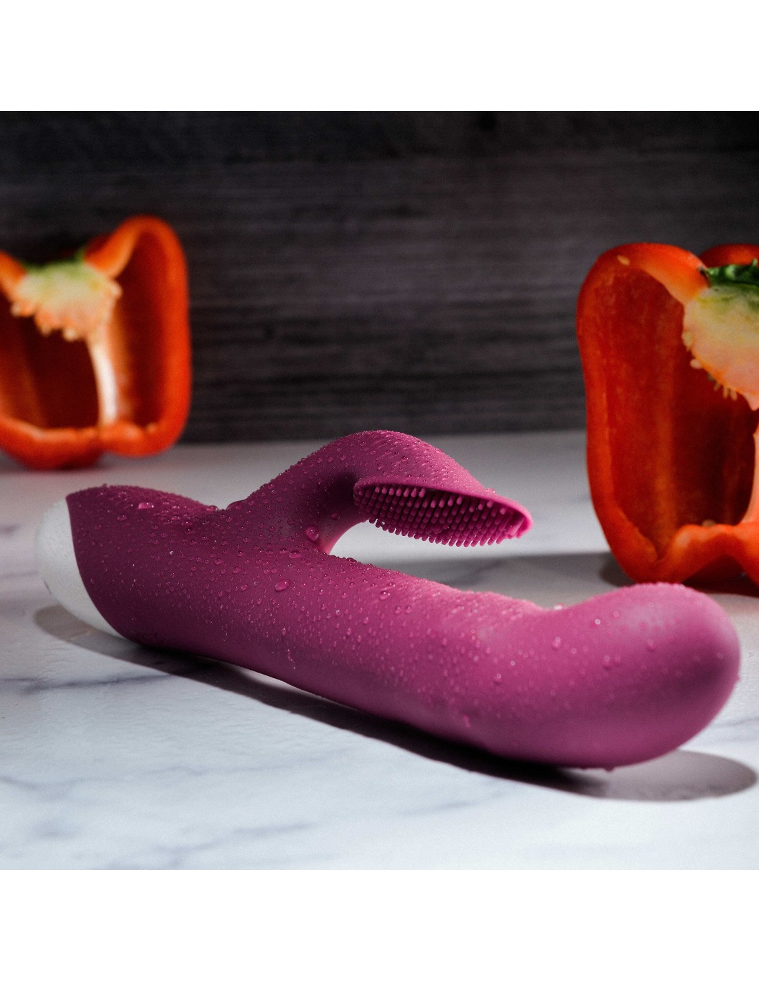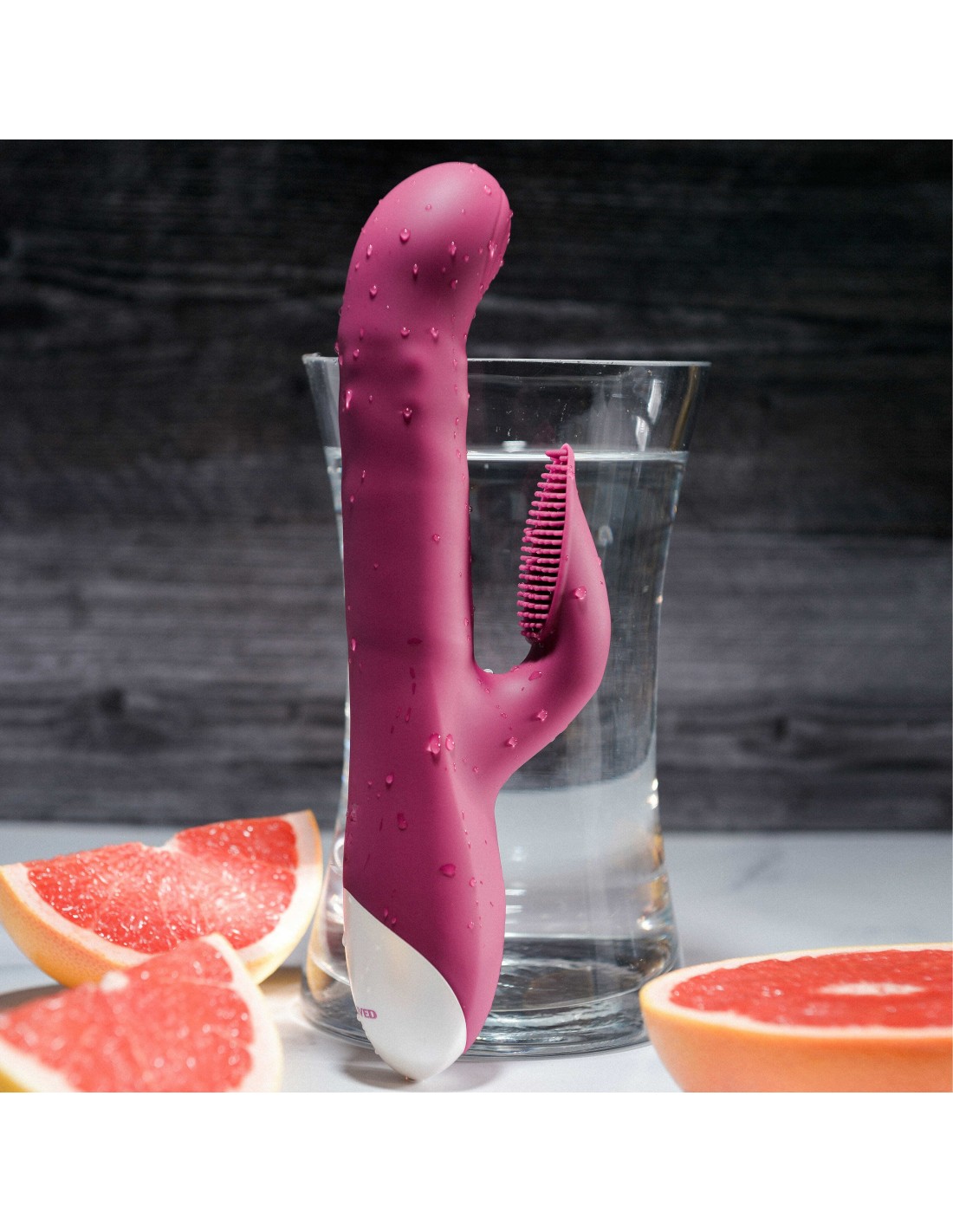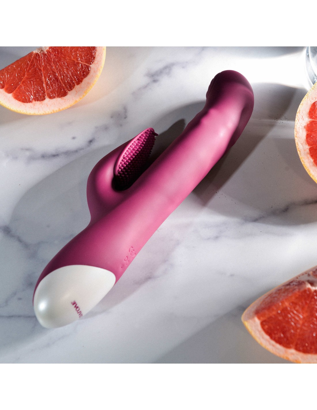 ¡Satisfaga múltiples antojos de placer a la vez! Dos potentes motores ofrecen una extraordinaria combinación de sensaciones: empuje, giro, vibración interna y externa, sin mencionar las temblorosas protuberancias que bailan por toda la plataforma del eje del clítoris. Elija entre 3 velocidades de empuje y giro, y ajuste el eje del clítoris de 10 velocidades para encontrar la combinación perfecta que haga realidad sus fantasías de rizar los dedos de los pies, incluso bajo el agua, ya que es completamente sumergible. Limpiar con un limpiador de juguetes y enjuagar con agua tibia.