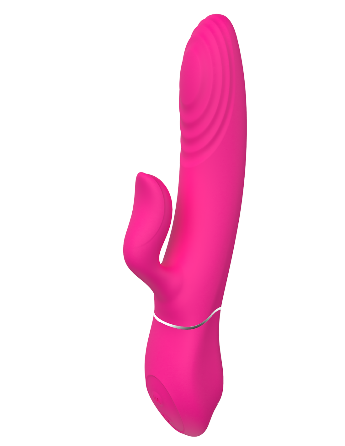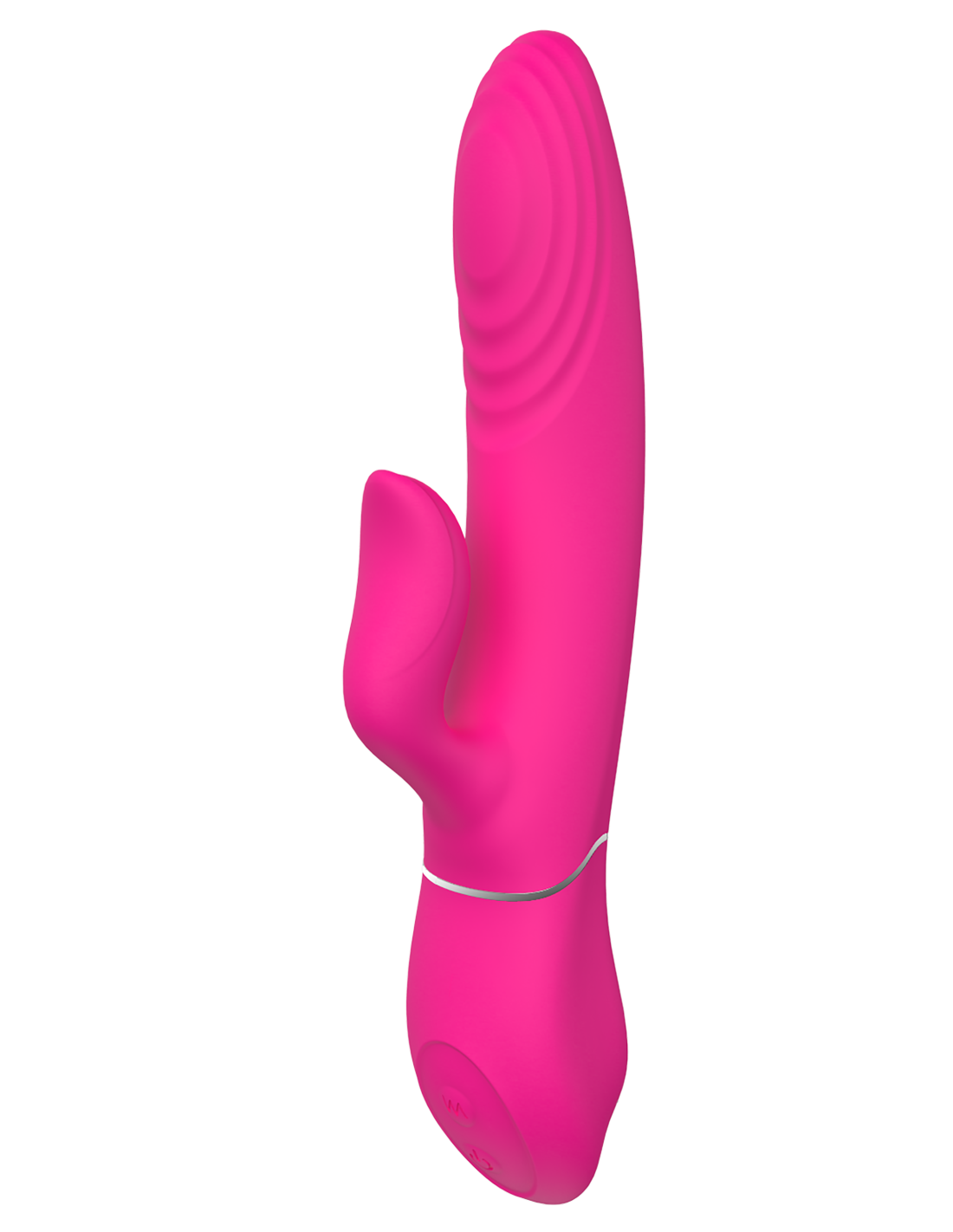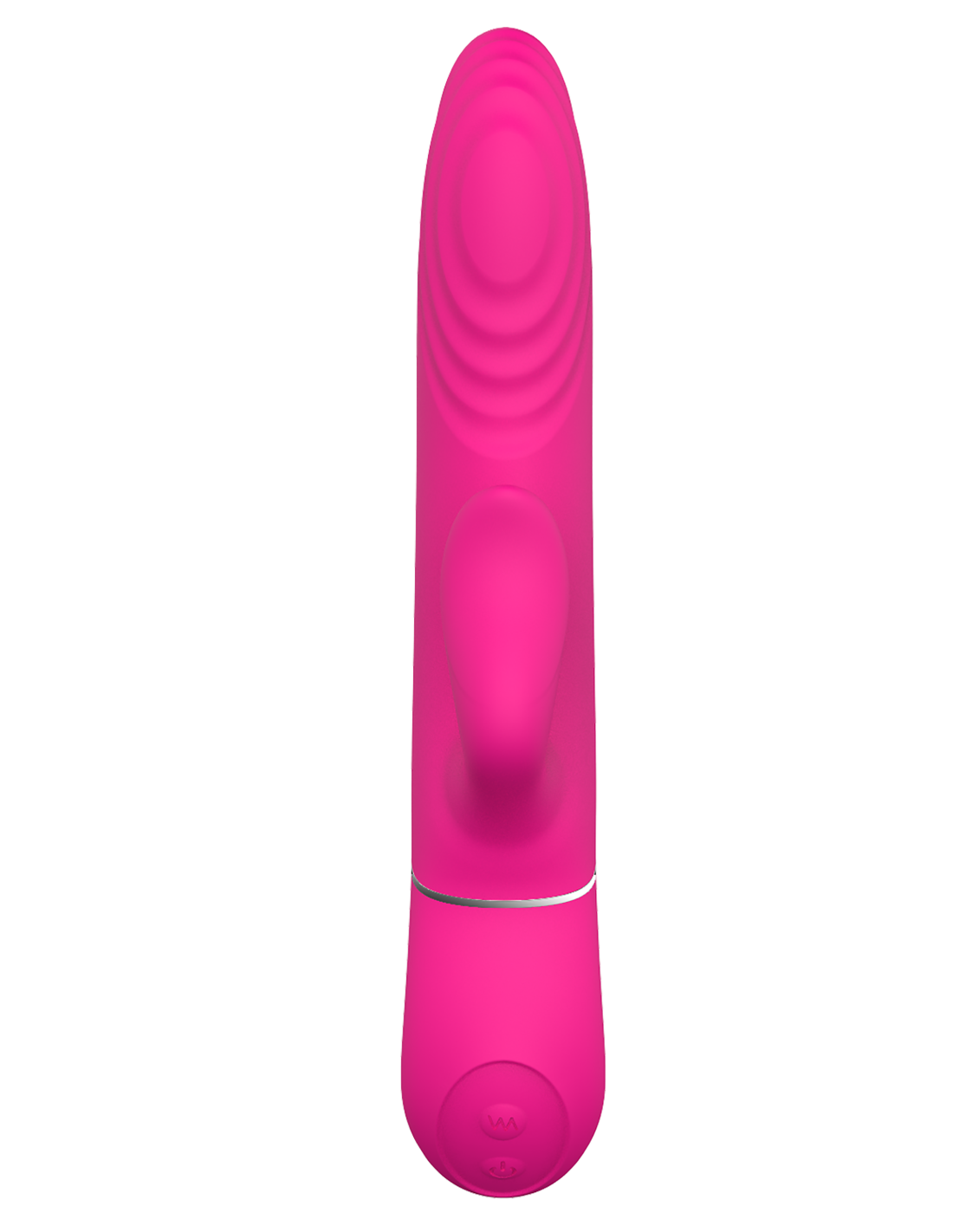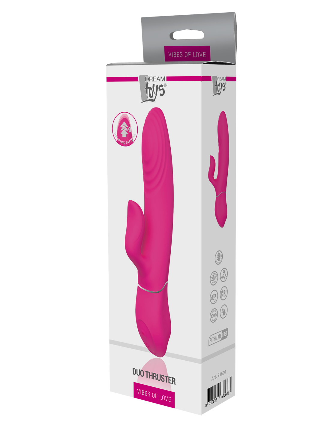 El vibrador Duo Thruster tiene 2 potentes motores que generan fuertes vibraciones. Su característica especial es la capacidad del eje de realizar movimientos de empuje en 9 niveles diferentes. Esto da como resultado sensaciones excitantes únicas. El estimulador de clítoris del Duo Thruster ofrece 3 niveles de vibración constante y 6 ritmos diferentes. El estimulador de pene y de clítoris tiene cada uno su propio motor potente. Utilice el propulsor en la bañera o la ducha sin preocupaciones, ¡es totalmente impermeable!