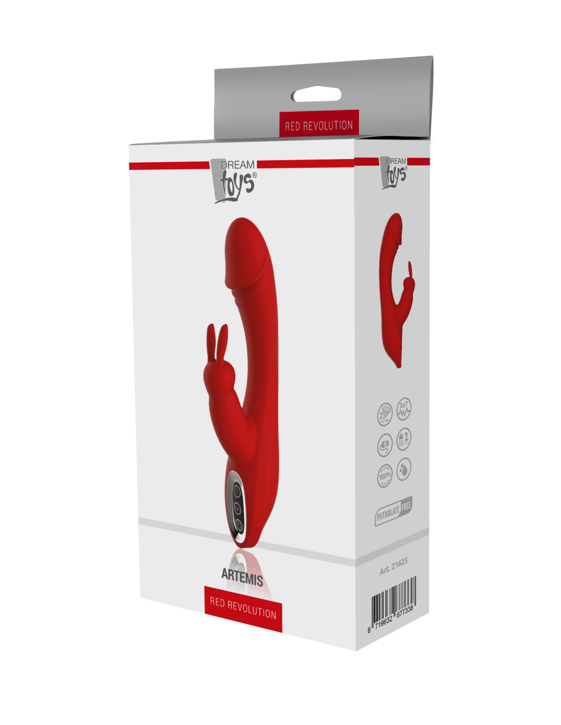Un vibrador de conejo con un eje ligeramente curvado y una punta en forma de glande, ideal para la estimulación del punto G, y 2 suaves cosquillas en las orejas de conejo en el estimulador del clítoris. El Artemis tiene un eje flexible, es recargable y tiene 2 potentes motores. Uno está situado en la parte superior con forma de cabeza del pene y el otro motor está en el estimulador del clítoris. El eje tiene 3 niveles de vibraciones constantes y 4 ritmos diferentes. El estimulador de conejito tiene 3 niveles de vibraciones constantes.