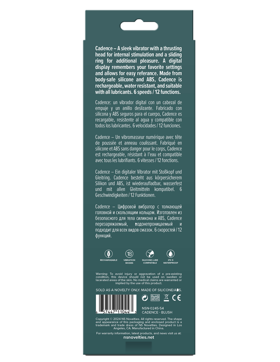 Cadence – Un vibrador elegante con una cabeza de empuje para la estimulación interna y un anillo deslizante para un placer adicional. Una pantalla digital recuerda sus configuraciones favoritas y permite una fácil referencia. Fabricado con silicona y ABS seguros para el cuerpo, Cadence es recargable, resistente al agua y apto con todos los lubricantes.