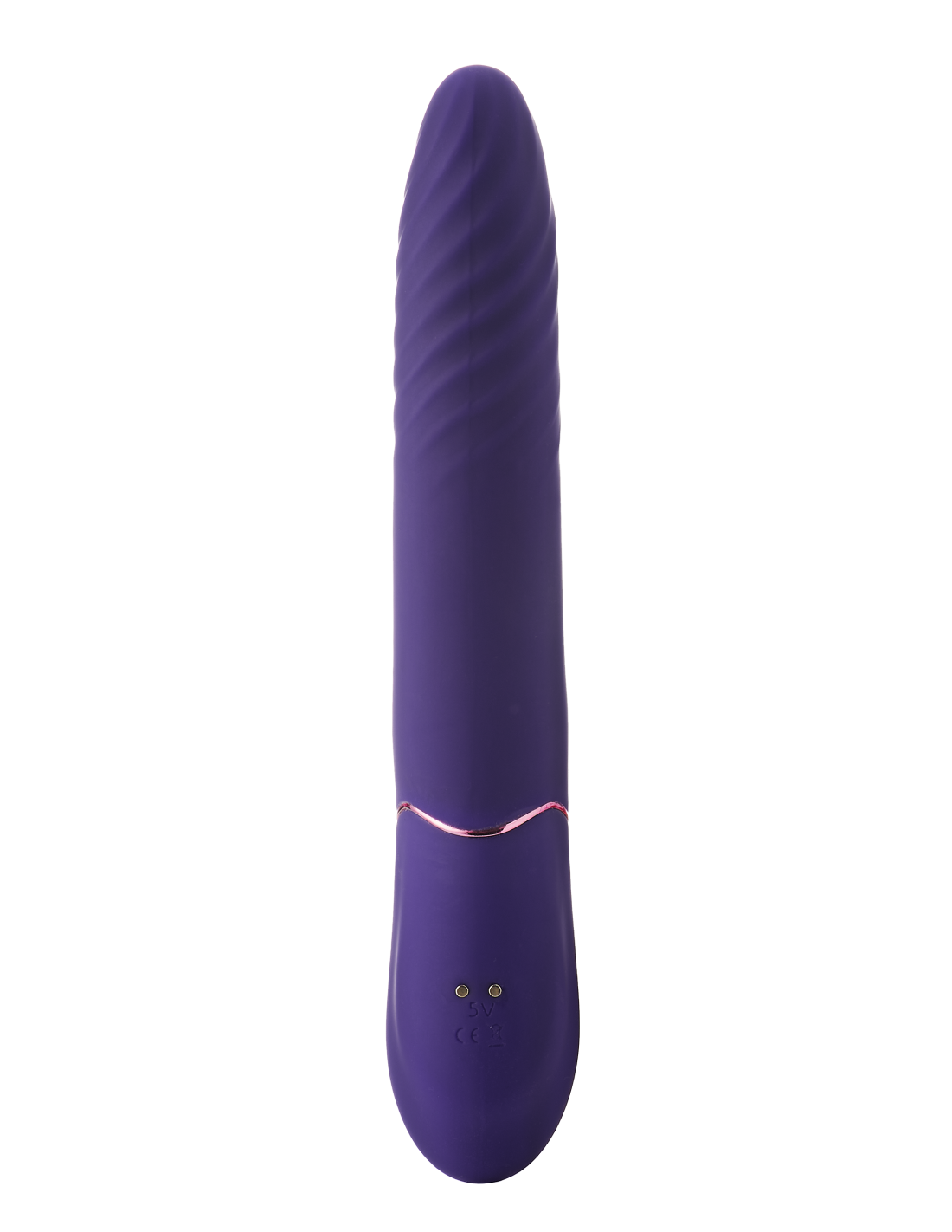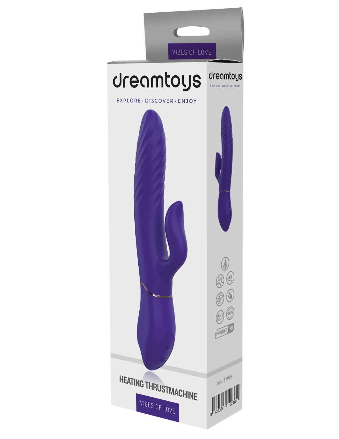 La Heating Thrust Machine es un vibrador dúo de empuje con 9 ritmos de vibración en el cuerpo principal y 9 en el estimulador del clítoris, ¡más 9 velocidades de empuje! Este vibrador de la colección Vibes of Love también cuenta con una función de calentamiento: la parte superior se calienta a la temperatura corporal tan pronto como se activan las vibraciones. Todas las vibraciones se pueden activar de forma independiente. El vibrador dúo Heating Thrust Machine es resistente al agua IPX7 y recargable con el cable USB magnético incluido. Nivel de ruido < 50 dB. Fabricado en silicona de grado médico y ABS, seguro para el cuerpo.