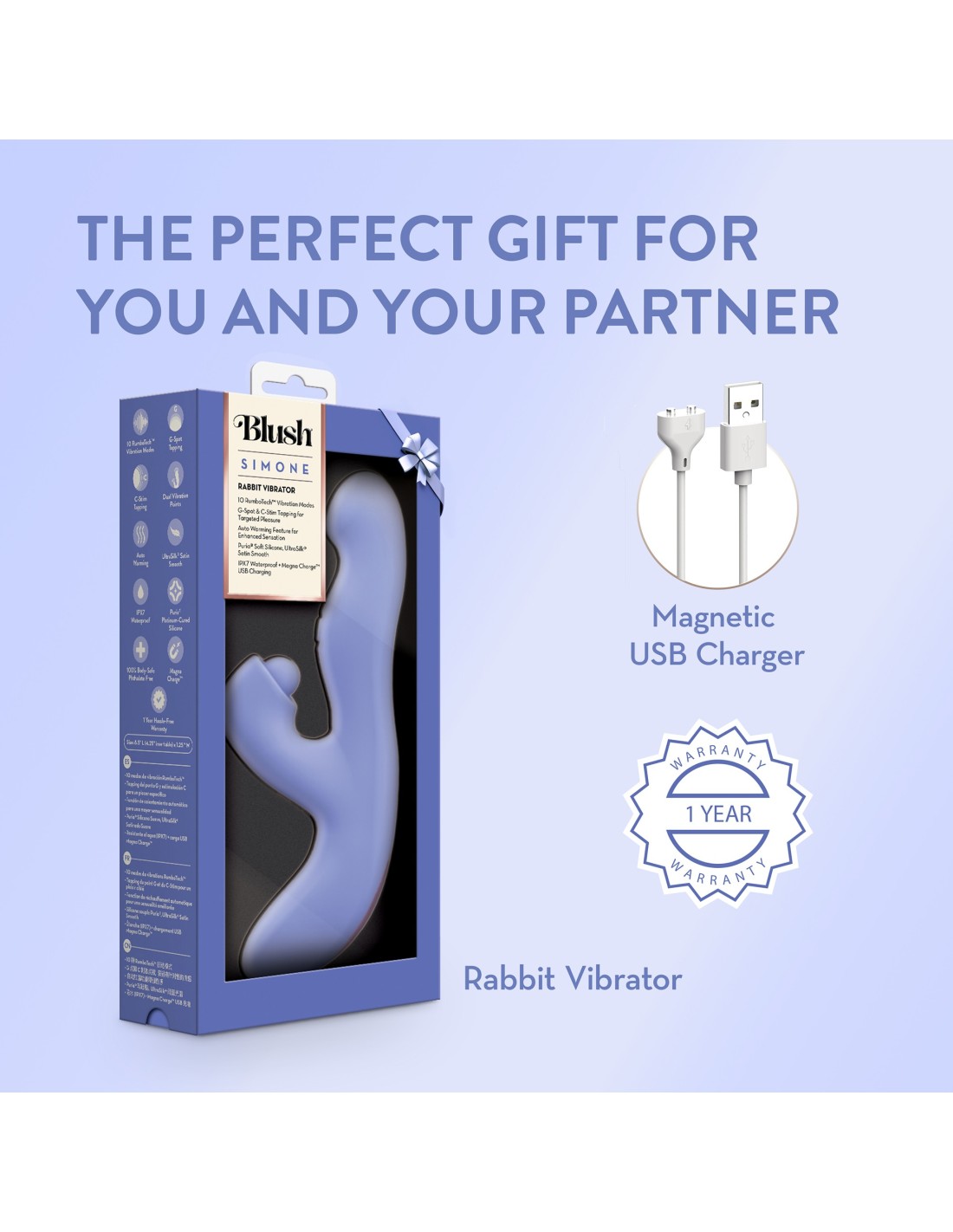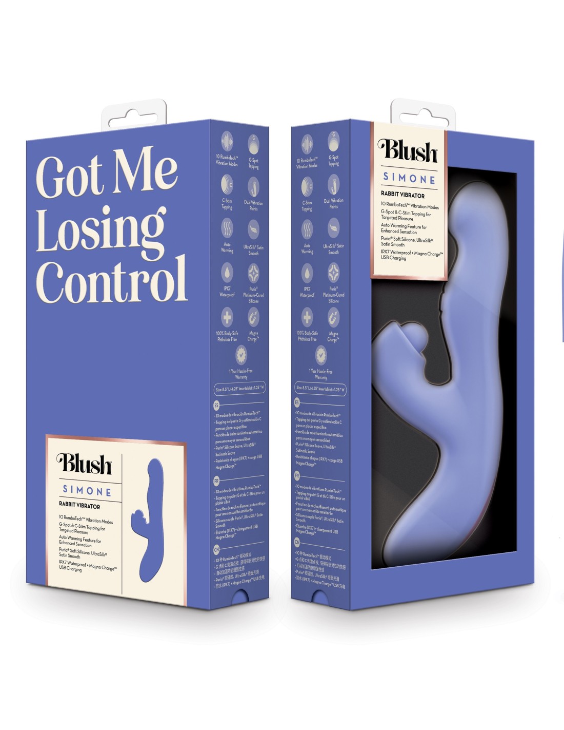 Conoce a Simone, tu apasionada compañera para la exploración íntima. Impulsado por RumboTech™ de Blush, este ambiente de conejo de doble estimulación bellamente diseñado combina 10 modos de vibración con funciones de golpeteo G-Spot y C-Stim para brindar sensaciones específicas exactamente donde las anhelas. Diseñado con un shaft flexible y un estimulador externo esculpido, Simone te invita a descubrir nuevas alturas de placer con precisión y pasión sin esfuerzo. La función de calentamiento automático agrega una capa de calor sensual, mejorando la intimidad y aumentando la anticipación con cada pulso. Confeccionada con silicona Puria® 100% segura para el cuerpo y envuelta en UltraSilk® suave y satinado, Simone se siente irresistiblemente suave y lujosa contra la piel. Con un diseño resistente al agua IPX7, disfrute de los placeres de Simone durante un baño o ducha relajante. La carga USB Magna Charge™ garantiza que siempre esté listo cuando tú lo estés. Audaz pero intuitiva, Simone es perfect para jugar en solitario o en pareja, lo que hace que cada encuentro sea inolvidable. Marca tu ritmo y prepárate para perder el control.