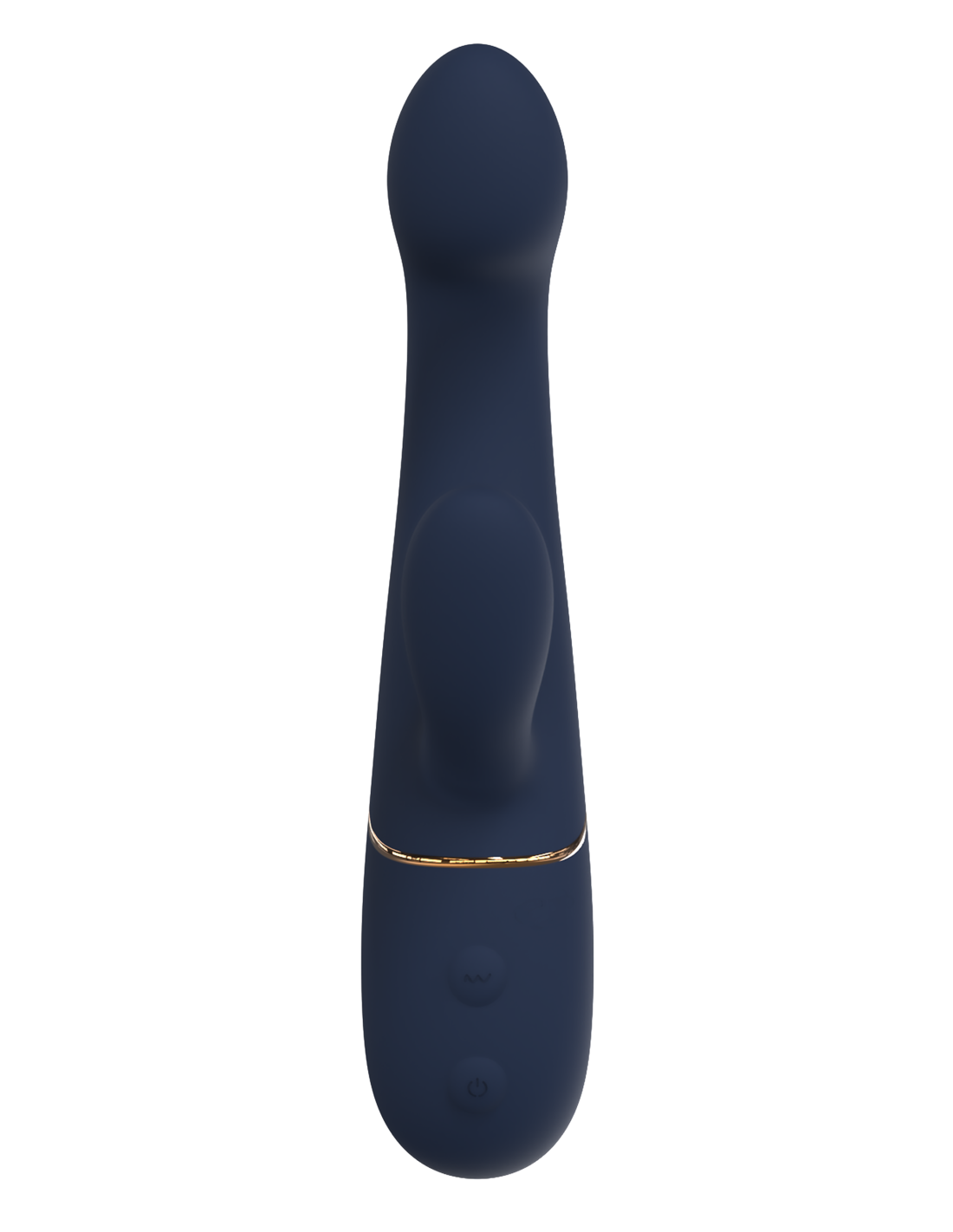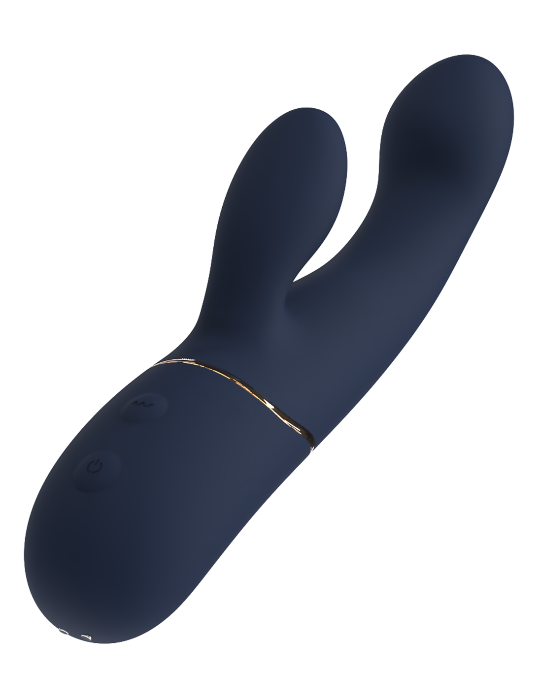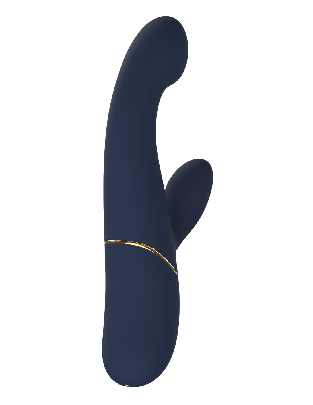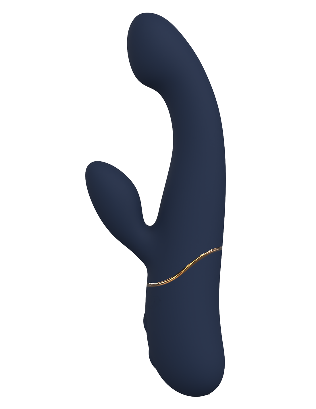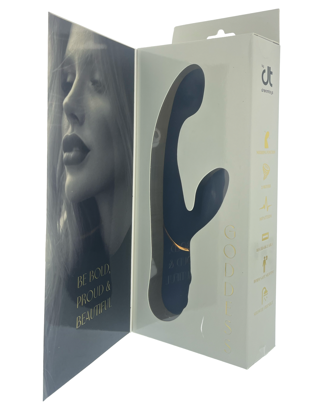 Vibrador dúo Hestia, con función de cabeceo. En el mismo estilo que los otros juguetes Goddess Collection , Hestia vibe está hecho de silicona azul oscuro con detalles dorados. El Goddess Collection duo vibe tiene 10 vibraciones de cabeceo en el cuerpo principal y 7 ritmos de vibración y 3 velocidades en el estimulador de clítoris. Para facilitar su uso, hay botones separados para controlar las funciones del cuerpo principal y las del estimulador de clítoris. El vibrador es apto para la ducha, está fabricado con materiales bodysafe y es recargable con el cable USB magnético incluido.