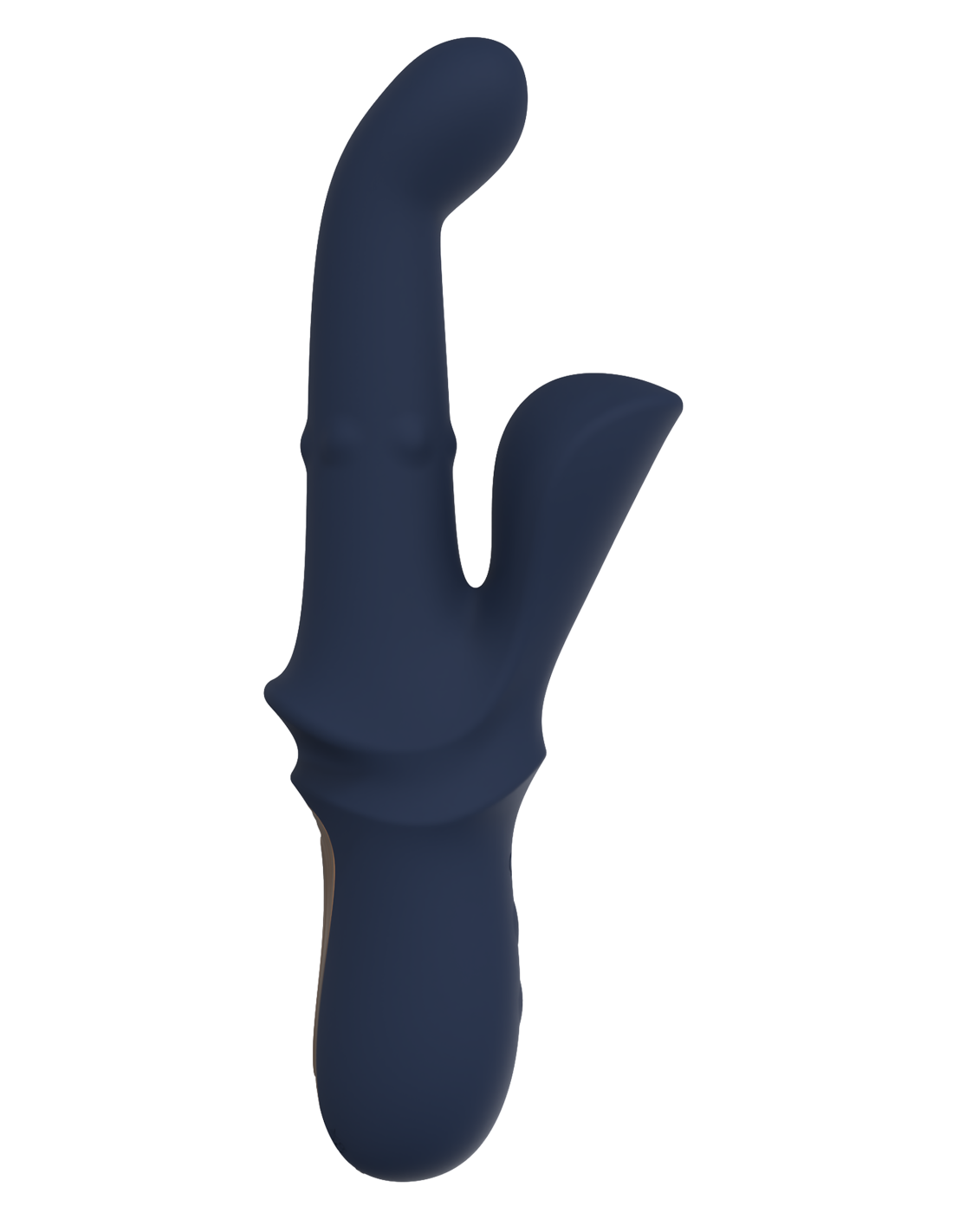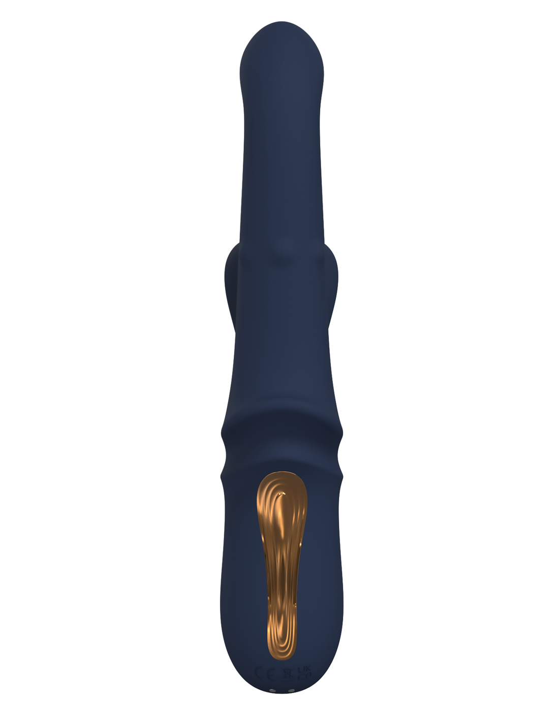 Vibrador dúo Iris, con perlas deslizantes y función de cabeceo. Al igual que los otros Goddess Collection juguetes, Iris está hecho de silicona azul oscuro con detalles dorados. El Goddess Collection duo vibe tiene 10 vibraciones de cuentas de cabeceo y deslizamiento en el cuerpo principal y 7 ritmos de vibración y 3 velocidades en el estimulador de clítoris. Para facilitar su uso, hay botones separados para controlar las funciones del cuerpo principal y las del estimulador de clítoris. Iris es apto para la ducha, está hecho de materiales seguros para el cuerpo y se puede recargar con el cable USB magnético incluido.