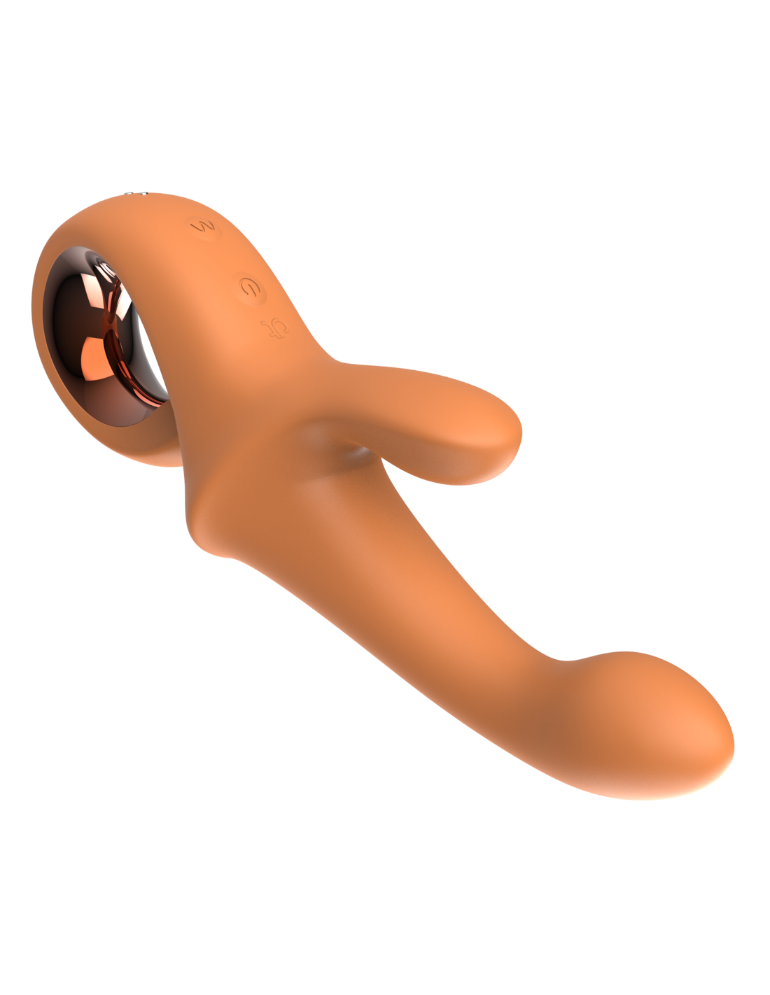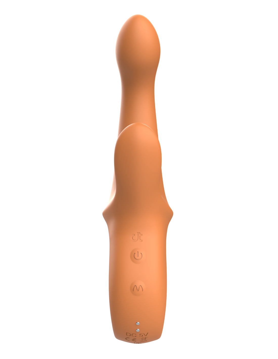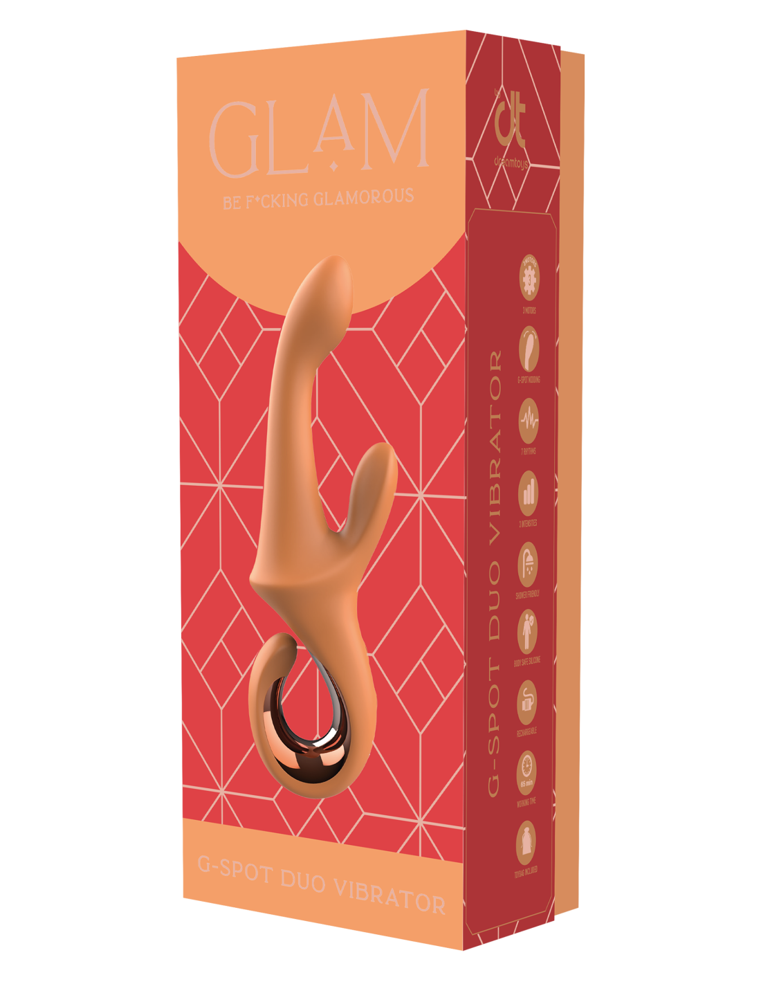 Vibrador dúo de punto G con función de cabeceo. Este vibrador Glam tiene 10 vibraciones de cabeceo en el cuerpo principal y 7 ritmos de vibración y 3 velocidades en el estimulador de clítoris. Para facilitar su uso, hay botones separados para controlar las funciones del cuerpo principal y las del estimulador de clítoris. El ambiente es apto para la ducha, está hecho de materiales seguros para el cuerpo y es recargable con el cable USB magnético incluido.