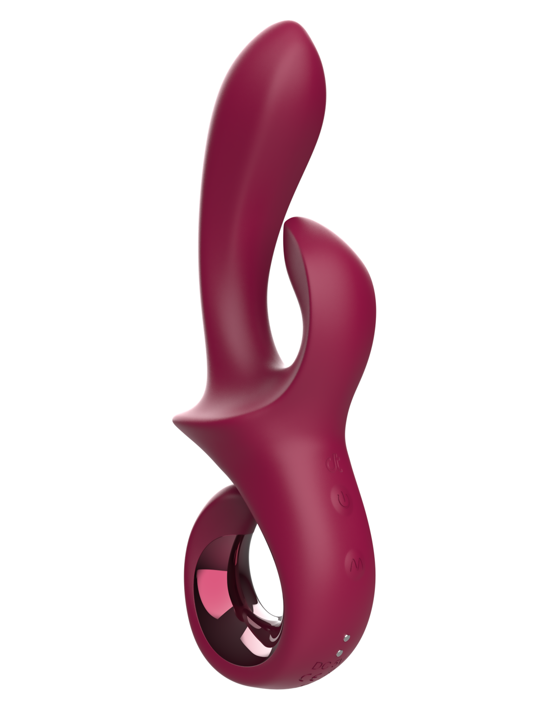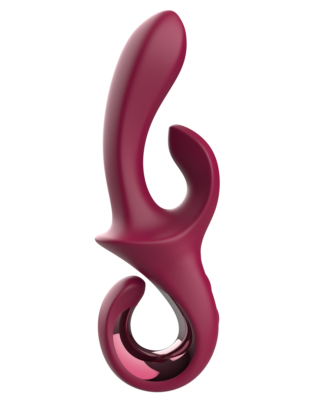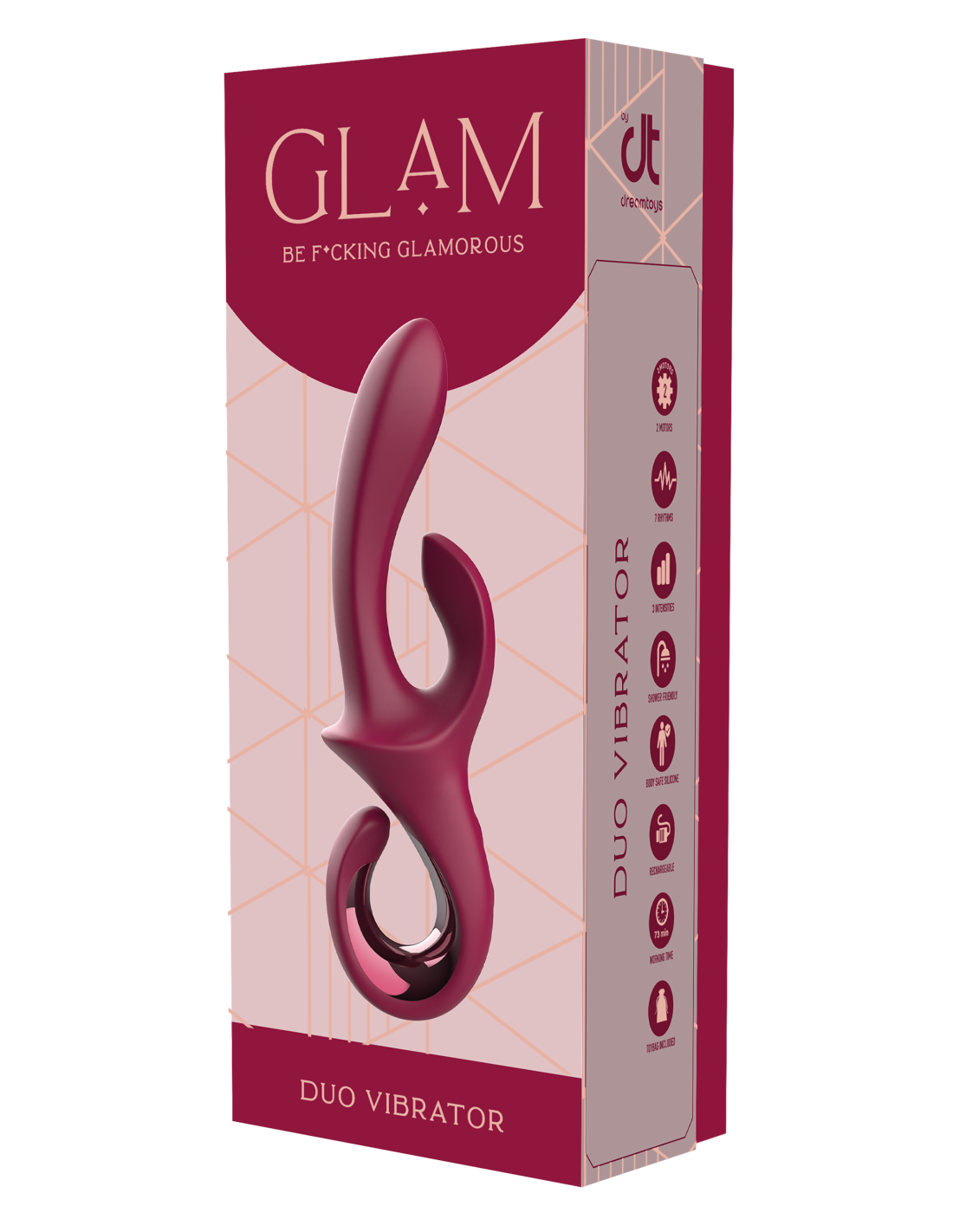 Vibrador dúo con carpa grande. Este vibrador Glam tiene 3 velocidades de vibración y 7 ritmos en el cuerpo principal y 3 velocidades de vibración y 7 ritmos en el estimulador de clítoris. Para facilitar su uso, hay botones separados para controlar las funciones del cuerpo principal y las del estimulador de clítoris. El Glam vibe es apto para la ducha, está hecho de materiales seguros para el cuerpo y es recargable con el cable USB magnético incluido.